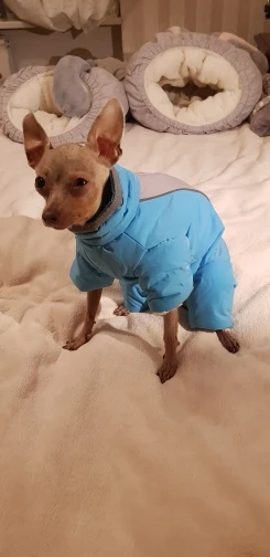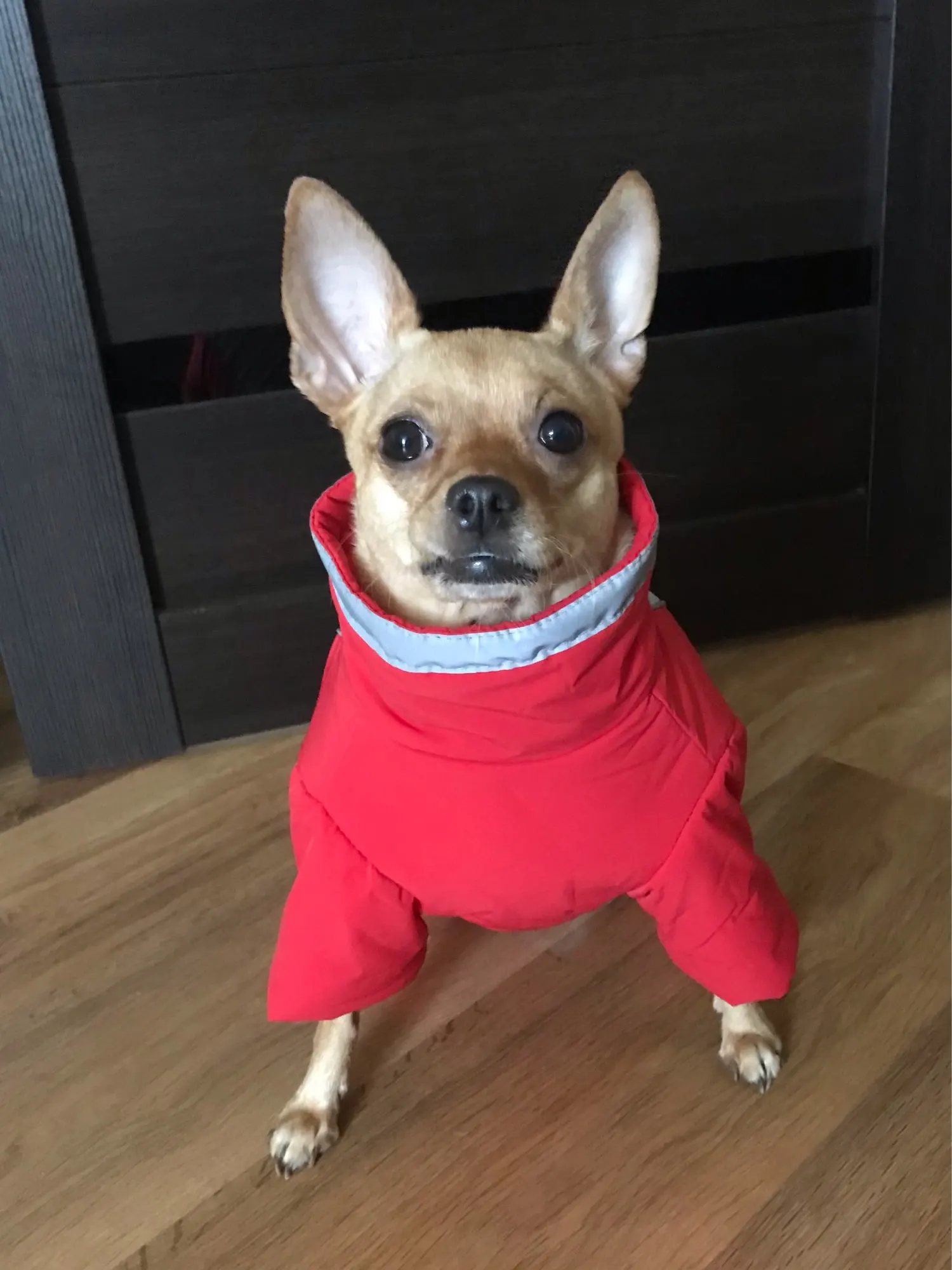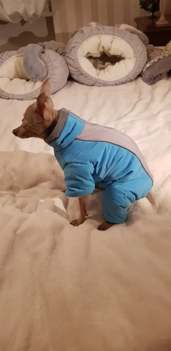 Подошёл на чихуа примерно 4,5-5кг веса. яркий, качественный. немного длинноват по спинке -прикрывает хвостик, буду подрезать и перешивать молнию. но, это именно для этой конкретной собачки. нравится, что не продуваемый и тёплый.