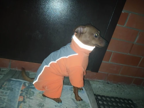 Комбенизон качественный, нитки не торчат. Постороннего запаха нет. Светоотражающие вставки. Мягкий флис внутри. Я довольна, собака в шоке и ступоре, это ее первая одежка. Размер XS 8 на мини тоя в самый раз. До Москвы доставка чуть меньше месяца.