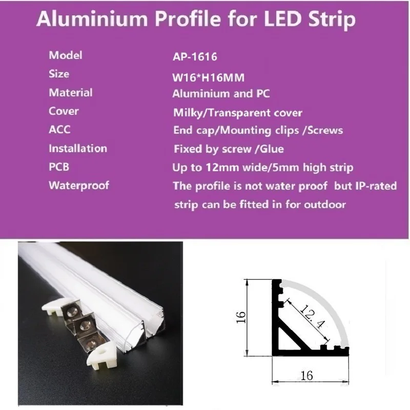 Спецификация:* Артикул: AP-1616* Размер: l500xw16xh16мм* Материал: алюминиевый корпус + крышка ПК* Ширина печатной платы: 5-12 ммАксессуары:1. Корпус светодиодного алюминиевого профиля: 50 см/комплект * 52. Торцевой колпачок: 2 шт./компл. * 53. Чехол из поликарбоната: молочный/прозрачный чехол из поликарбоната 50 см/комплект * 54. Крепежные зажимы: 2 шт./компл. * 55. Саморезы: 2 шт./компл. * 5Лента не входит в эту ссылку, разъем на 90/180 градусов нужно покупать самостоятельно