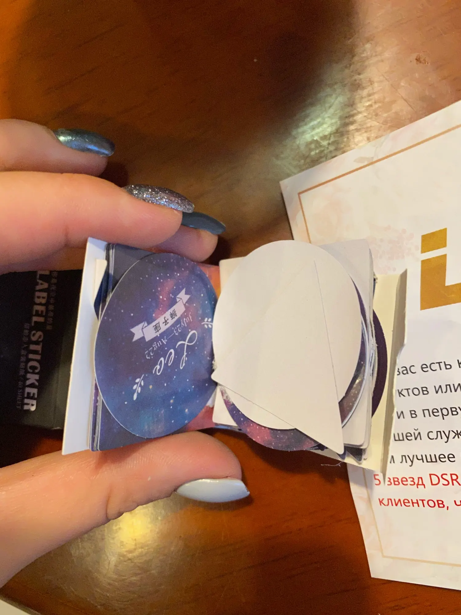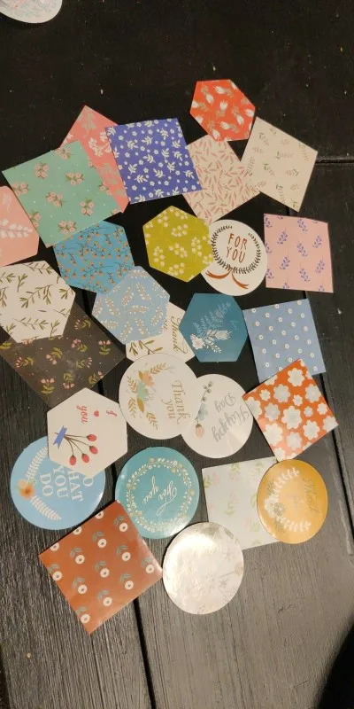 Не знаю, чем я думала, когда заказывала эти наклейки. Те, что кружочком (не все) - в них написан текст, который некуда применить. Сами по себе наклеечки милые, но напоминают по узорам кусочки обоев К товару претензий нет. Количество не считала. Пришли примерно за три недели.