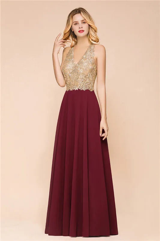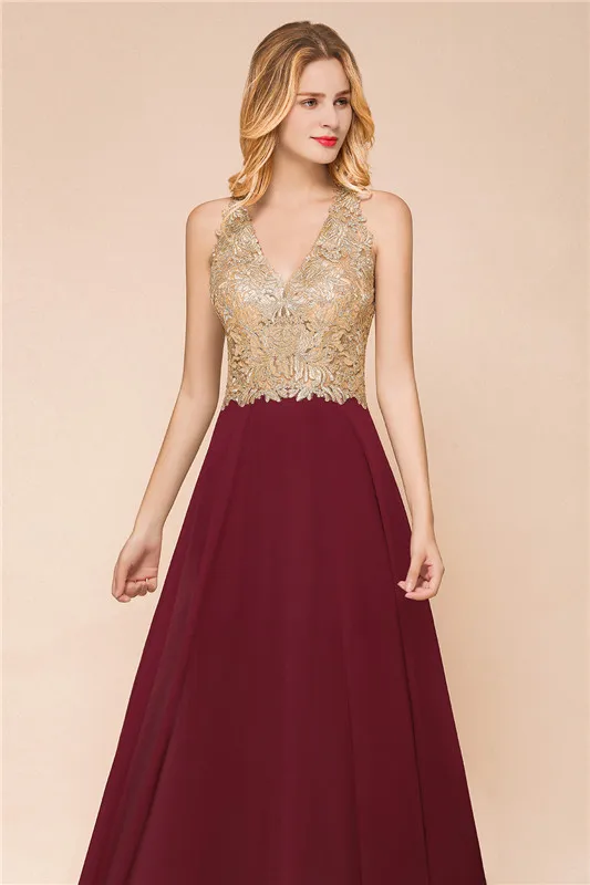 Бордовое длинное платье для выпускного вечера, 2021, с V-образным вырезом, без рукавов, с золотой кружевной аппликацией, элегантное, ТРАПЕЦИЕВИДНОЕ