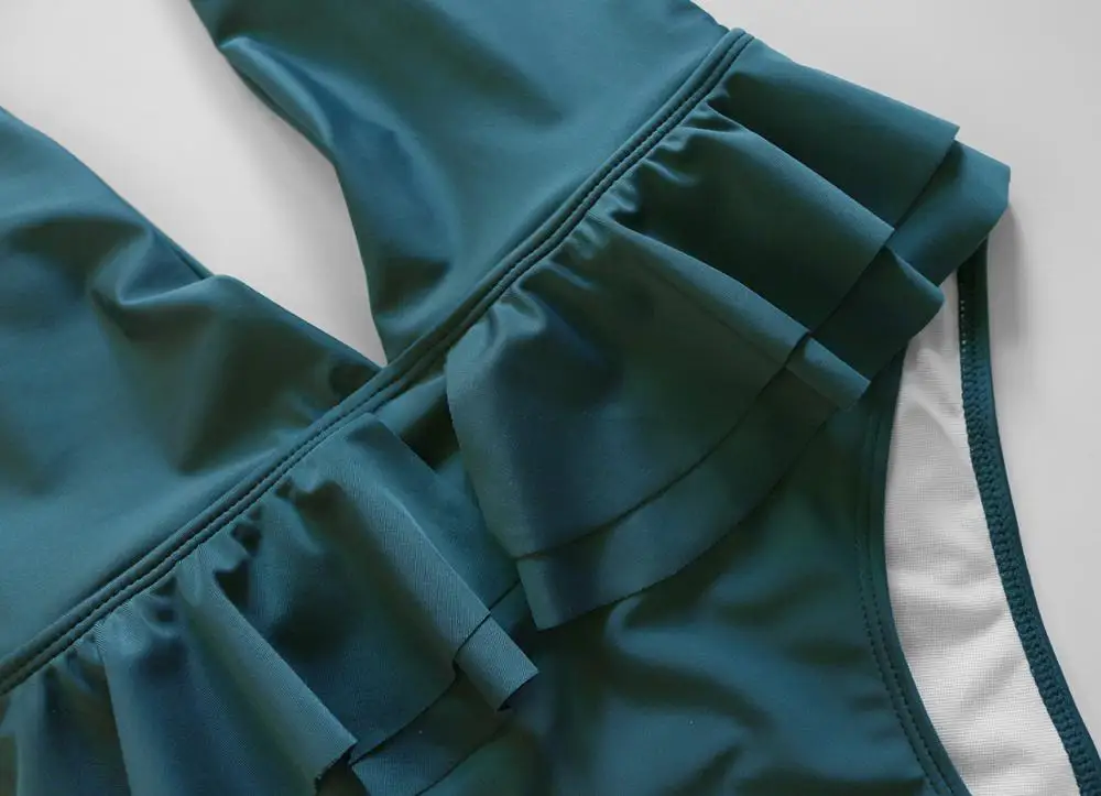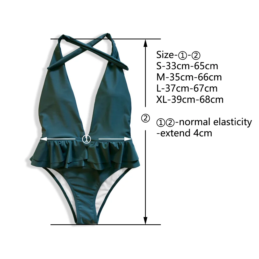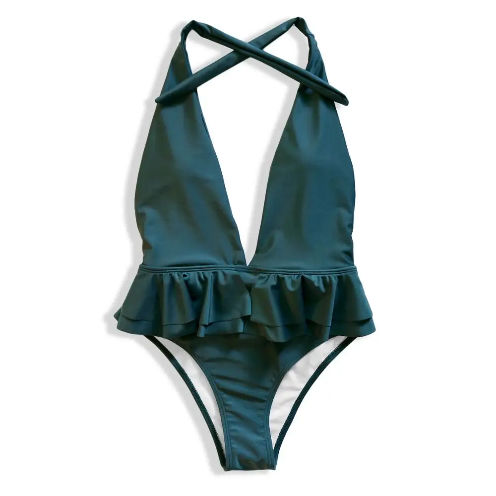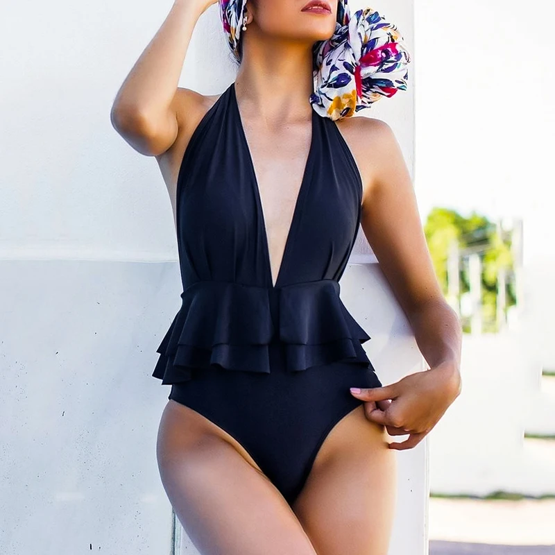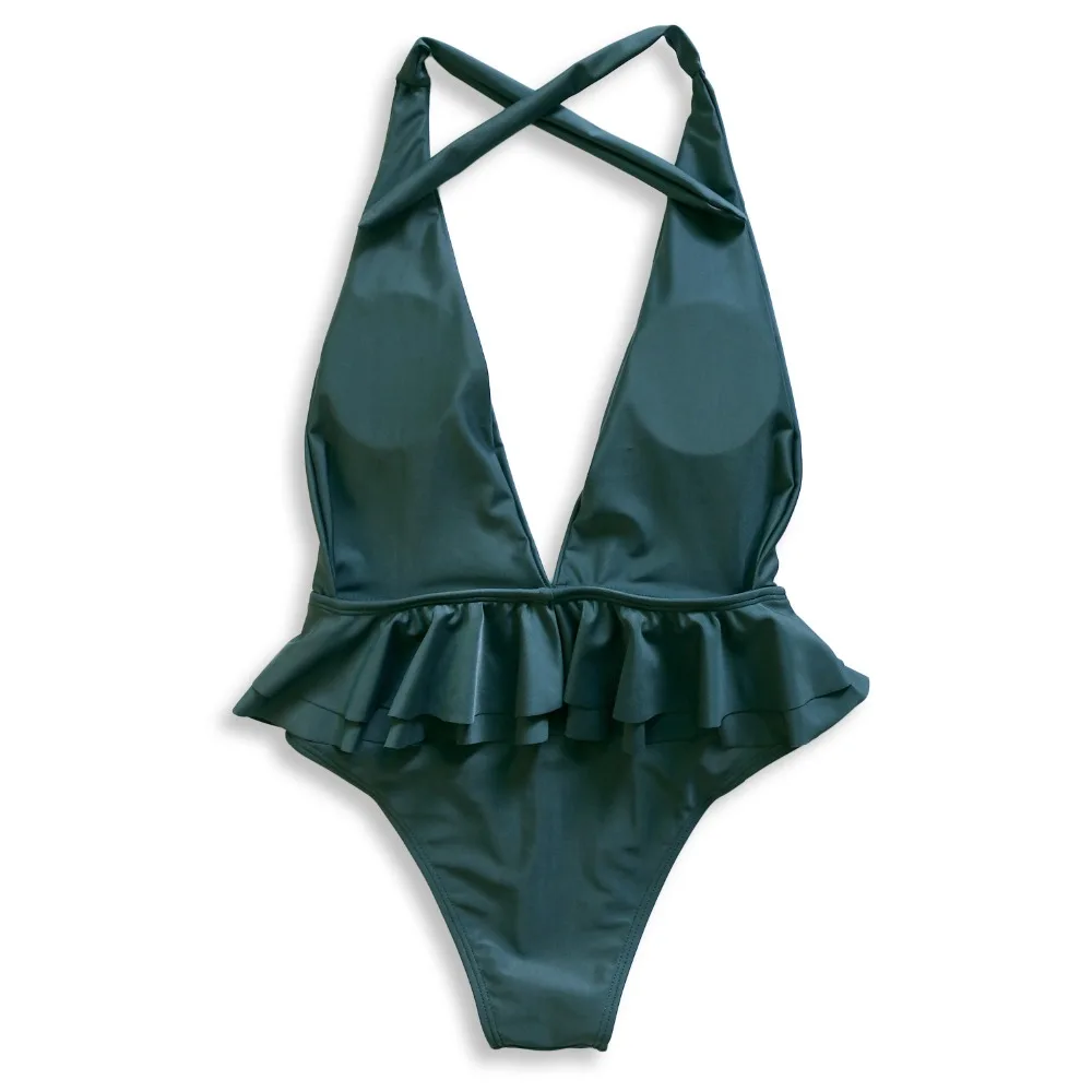 Сексуальный глубокий v-образный с рюшами Плавание Костюм Леди 2020 с лямкой на шее с открытой спиной Монокини стринги Одна деталь одежда Для женщин Плавание банный костюм трикини шимер ванны цельный купальник с баской