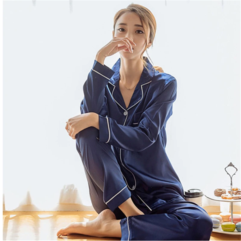 Весна-осень, свободная шелковая атласная Женская одежда для сна, пижамный комплект, однобортный Топ в полоску и длинные брюки, комплекты из двух предметов