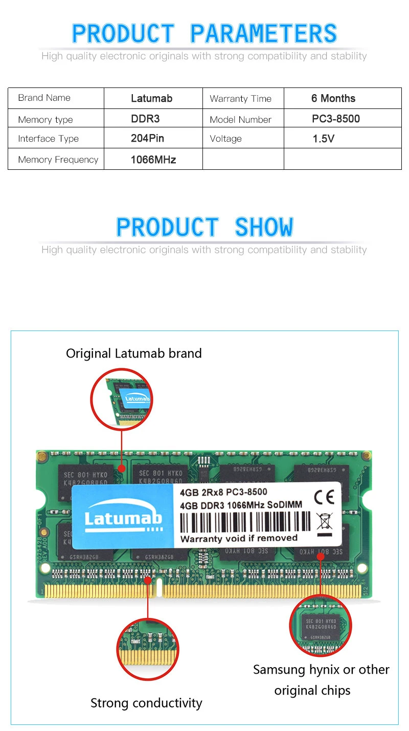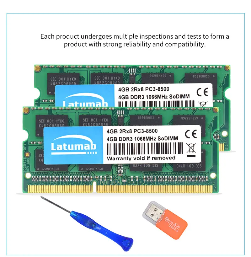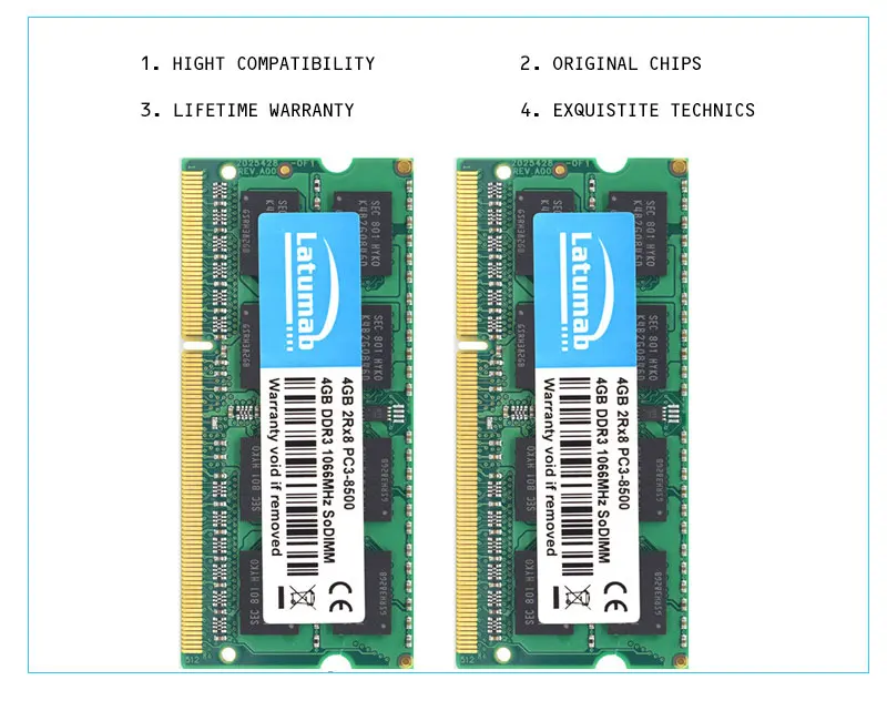 Модуль ОЗУ Latumab DDR3, 4816 ГБ, 1066 МГц, PC3-8500 контактов, SODIMM 204 в