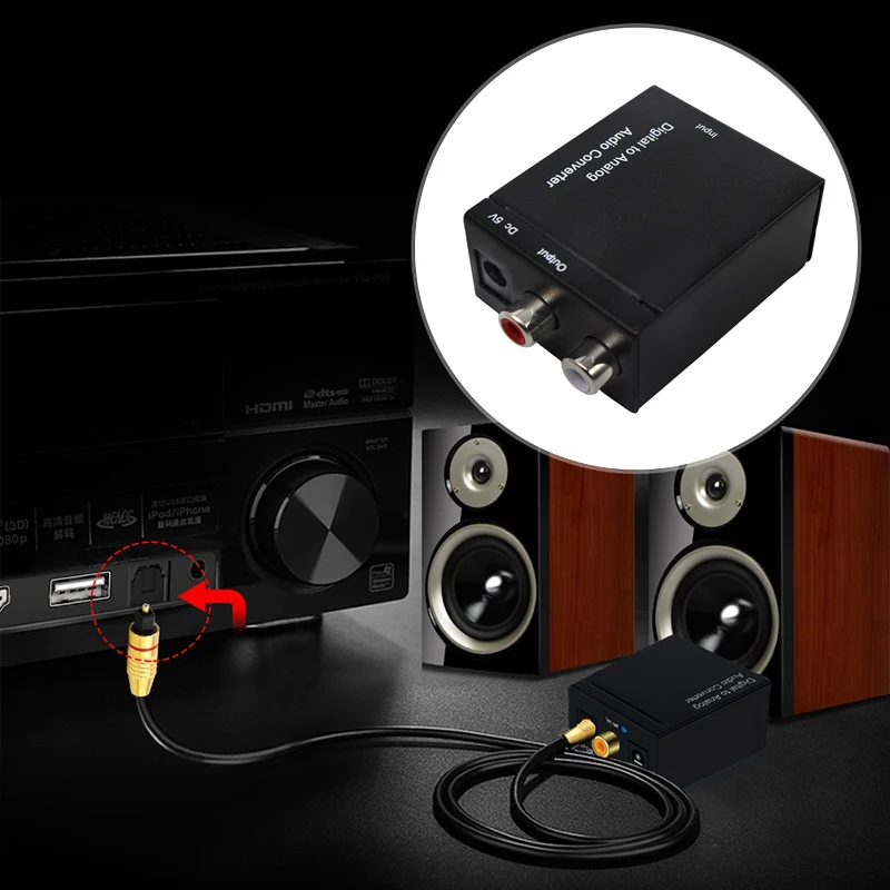 Он преобразует коаксиальные или Toslink цифровые аудио сигналы в аналоговый L/R аудио.