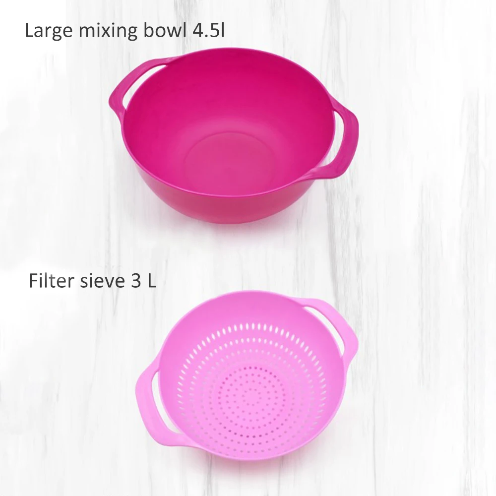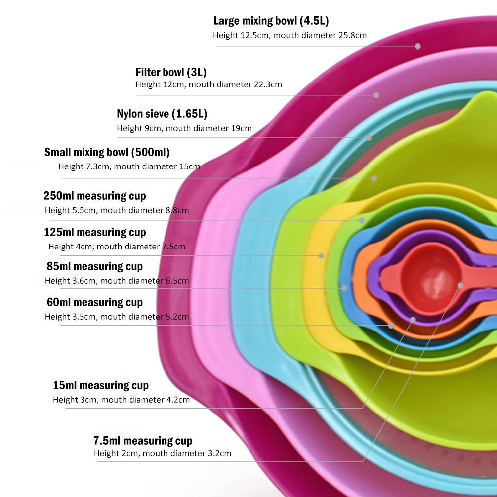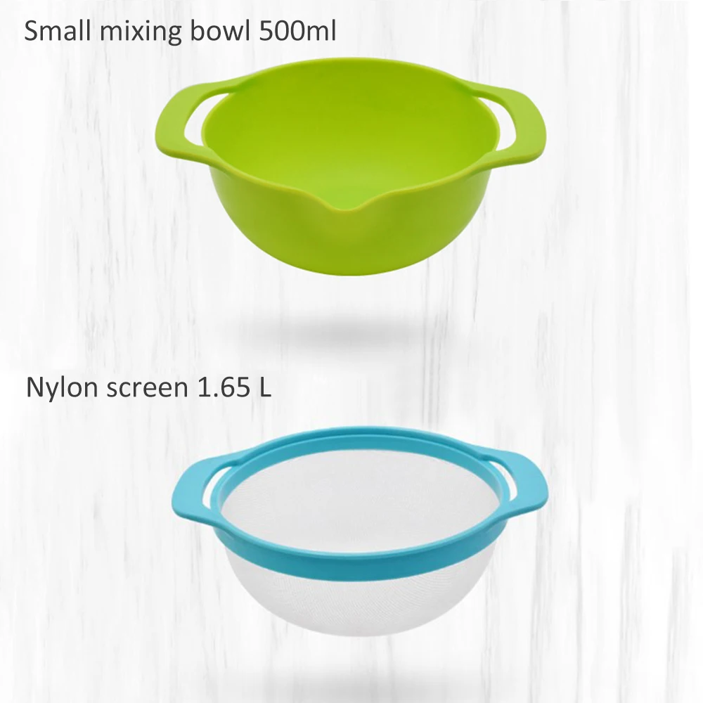 Посылка включает в себя:2 миски2 x сита6 мерных стаканчиков