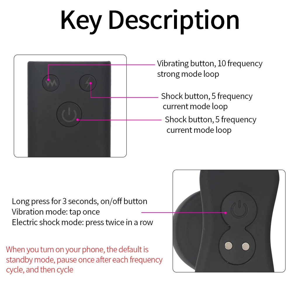 Режим вибрации: 10-частотная вибрация, 5-частотный Электрический шок Удаленный режим: беспроводной пульт дистанционного управления Режим питания: зарядка через USB Время зарядки: Зарядка около 1,5 часов (индикатор мигает во время зарядки, индикатор горит полностью) Время использования: время использования около 90 минут Водонепроницаемость: Водонепроницаемость Уровень шума: менее 50 децибел Упаковочный лист:Массажер простаты + пульт дистанционного управления + кабель для зарядки UBS + коробка