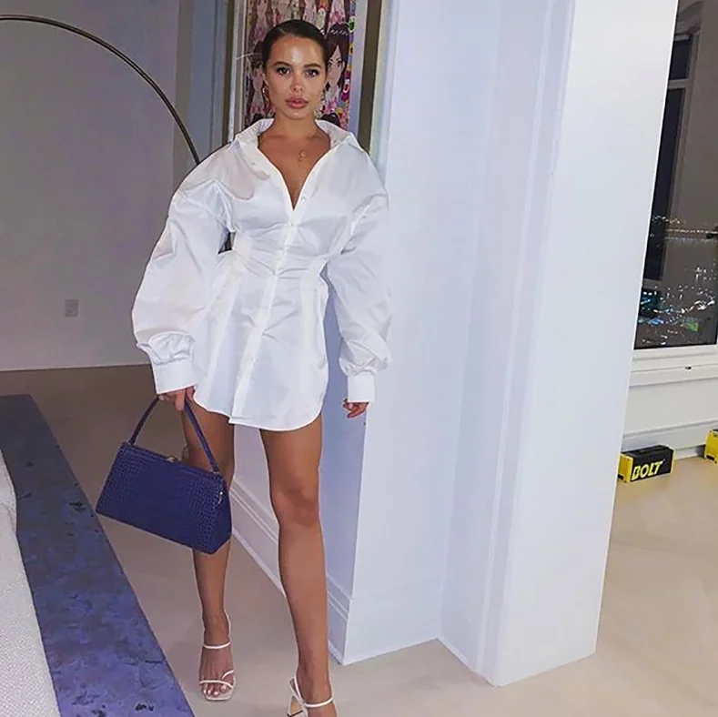 Женское платье-рубашка с глубоким V-образным вырезом, длинными рукавами-фонариками, с высокой талией, облегающее, сексуальное мини-платье для пляжа, осень 2019