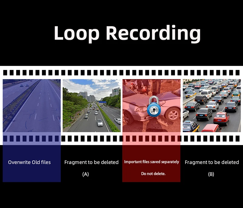Циклическая запись гарантирует, что ваша камера не прекратит запись при заполнении памяти. Камера автоматически перезаписывает самые старые файлы на карте памяти, что позволяет ей записывать неограниченное время.