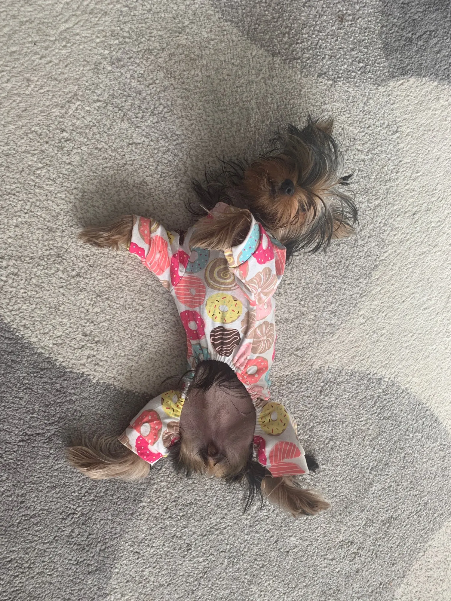 Отличные маленькие пижамы для собак. xl немного великоват для наших дочек 12 фунтов, но все равно милый