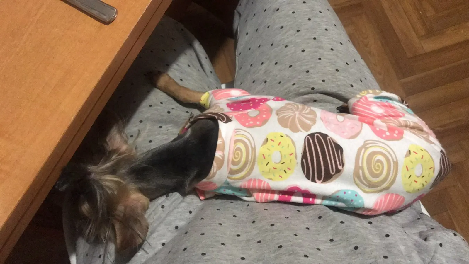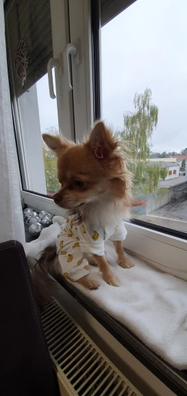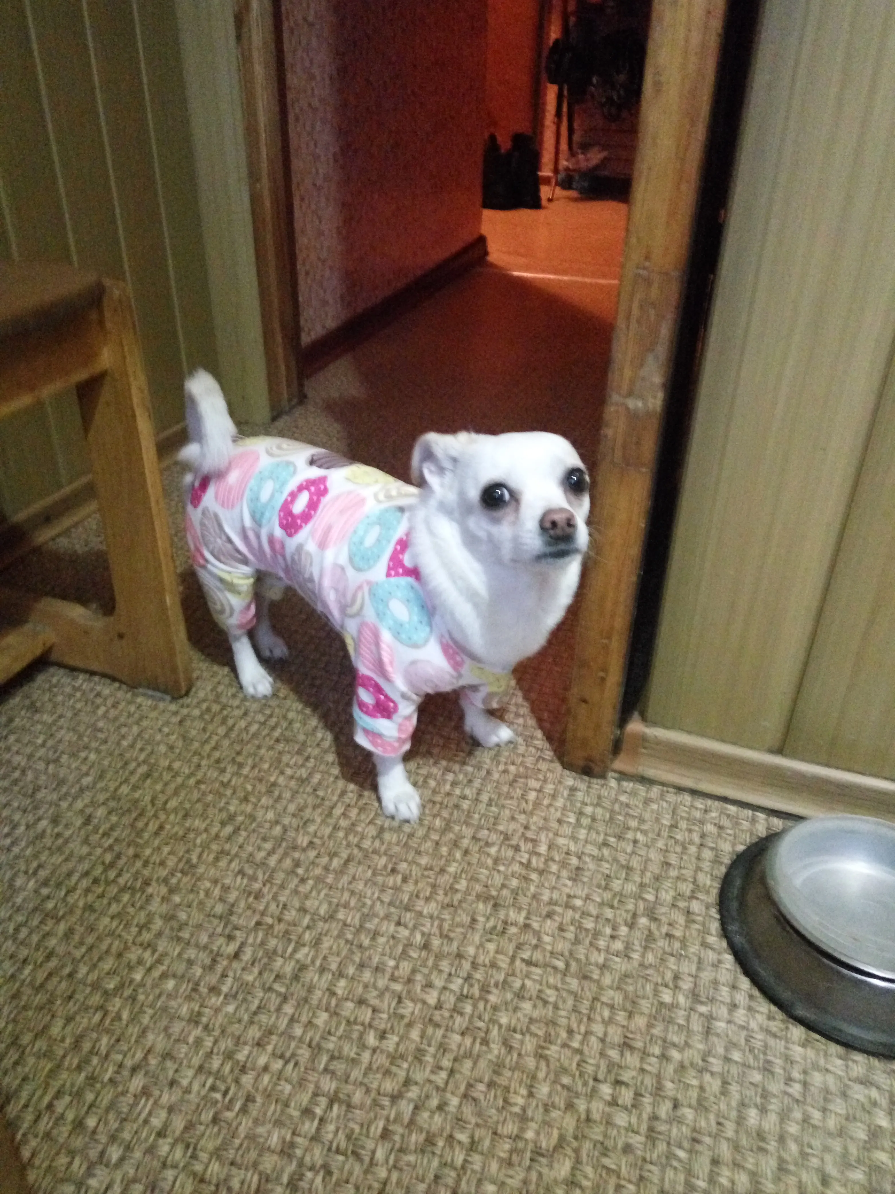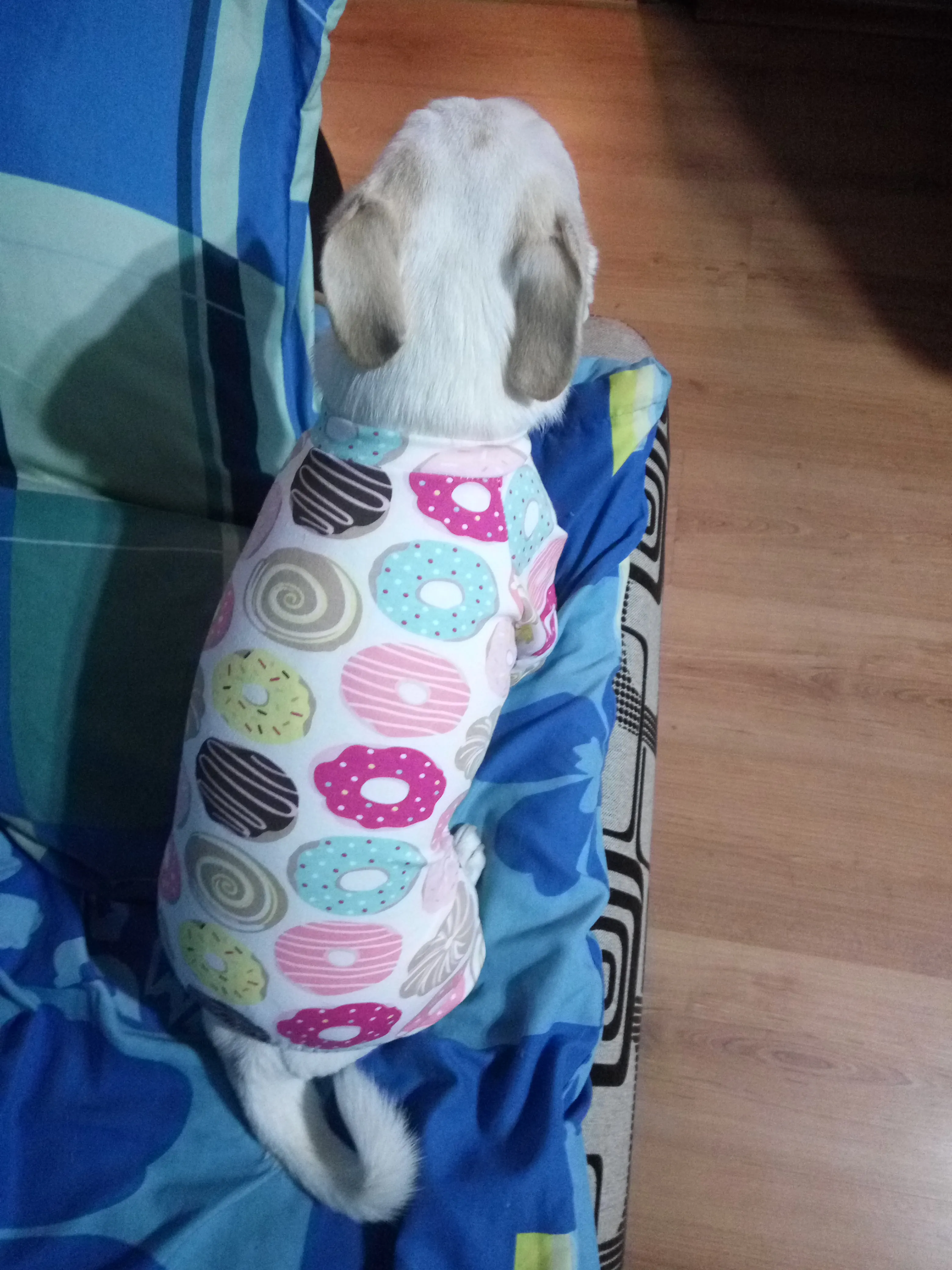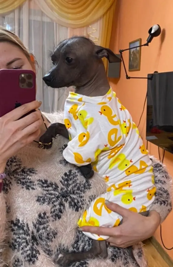 Пижамка классная! Жаль, что мой чихуахуа успел вырасти. Качество шикарное, чем то напоминает бодики грудничков.