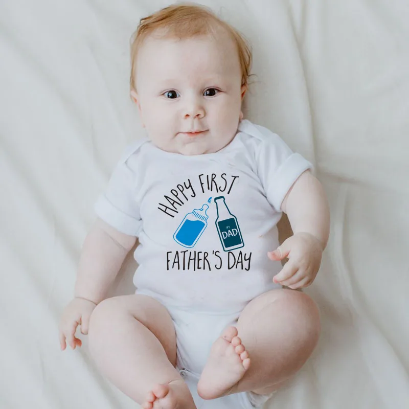 Счастливы во-первых с принтом для маленьких мальчиков и девочек, для новорожденных, для малышей с короткими рукавами; Детский хлопковый облегающий Fathers Day пижамные костюмы Летний Повседневный пляжный костюм
