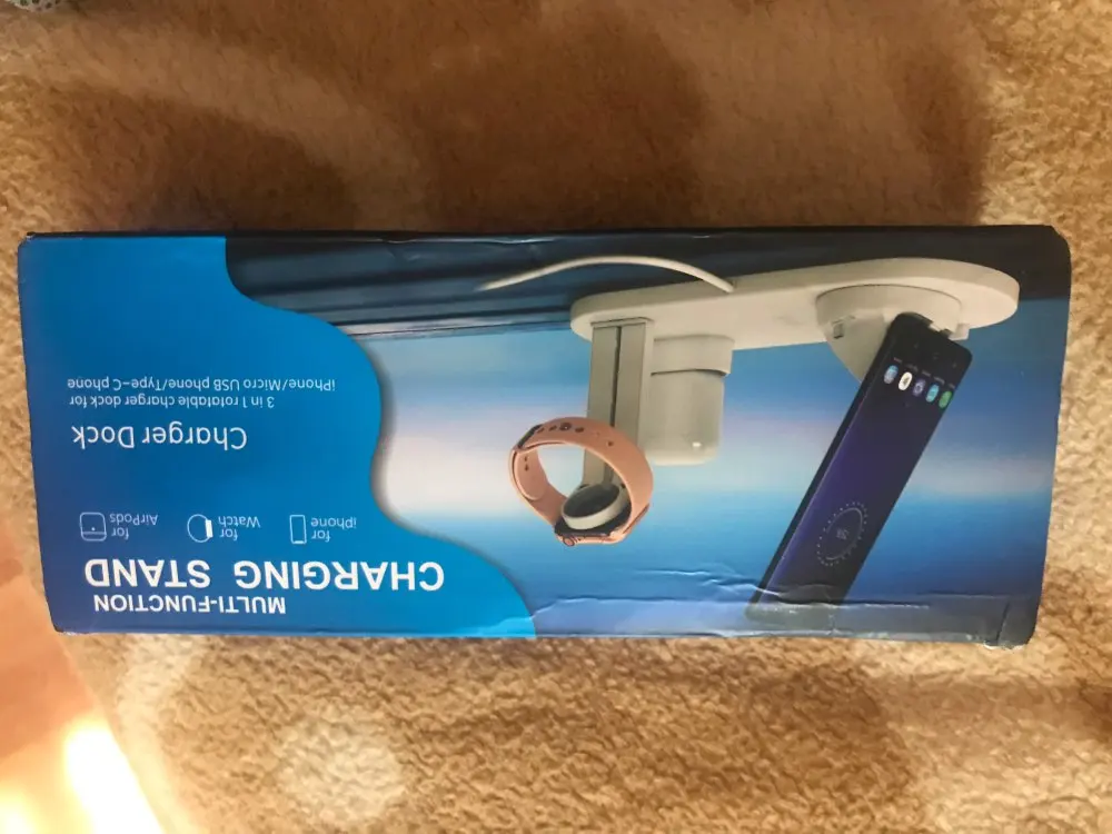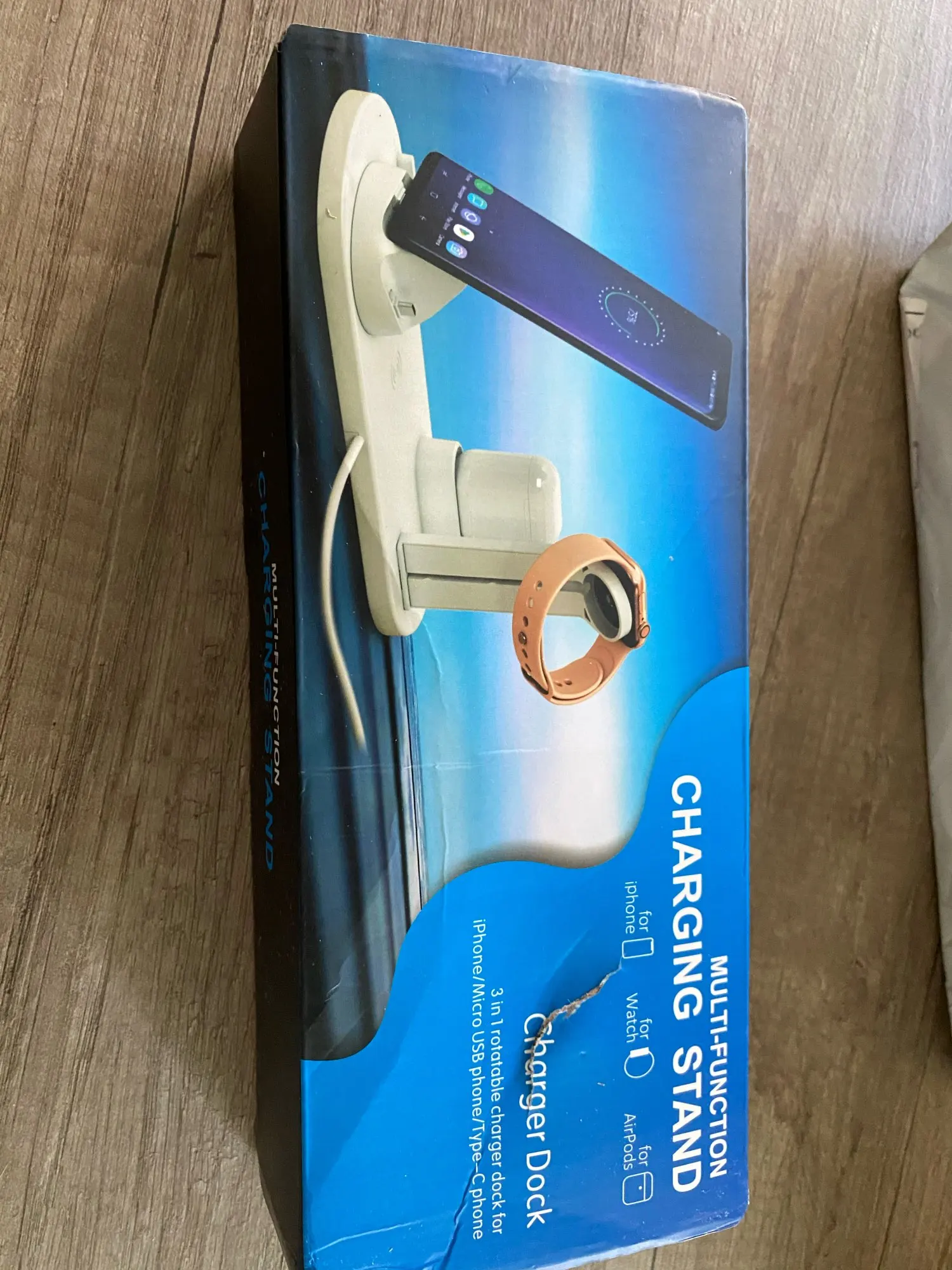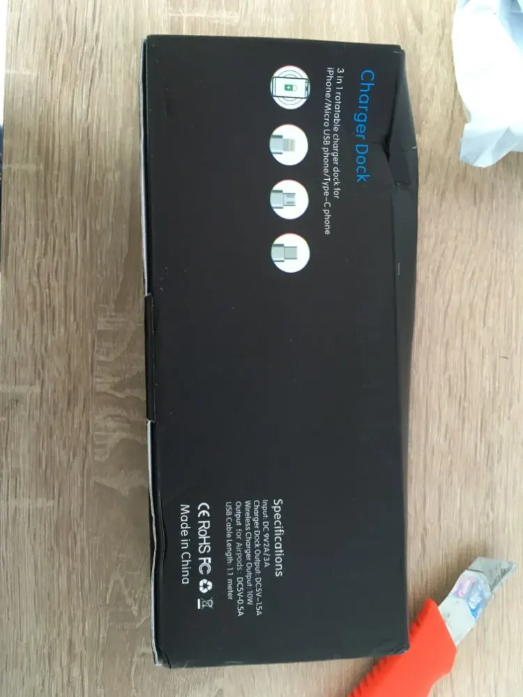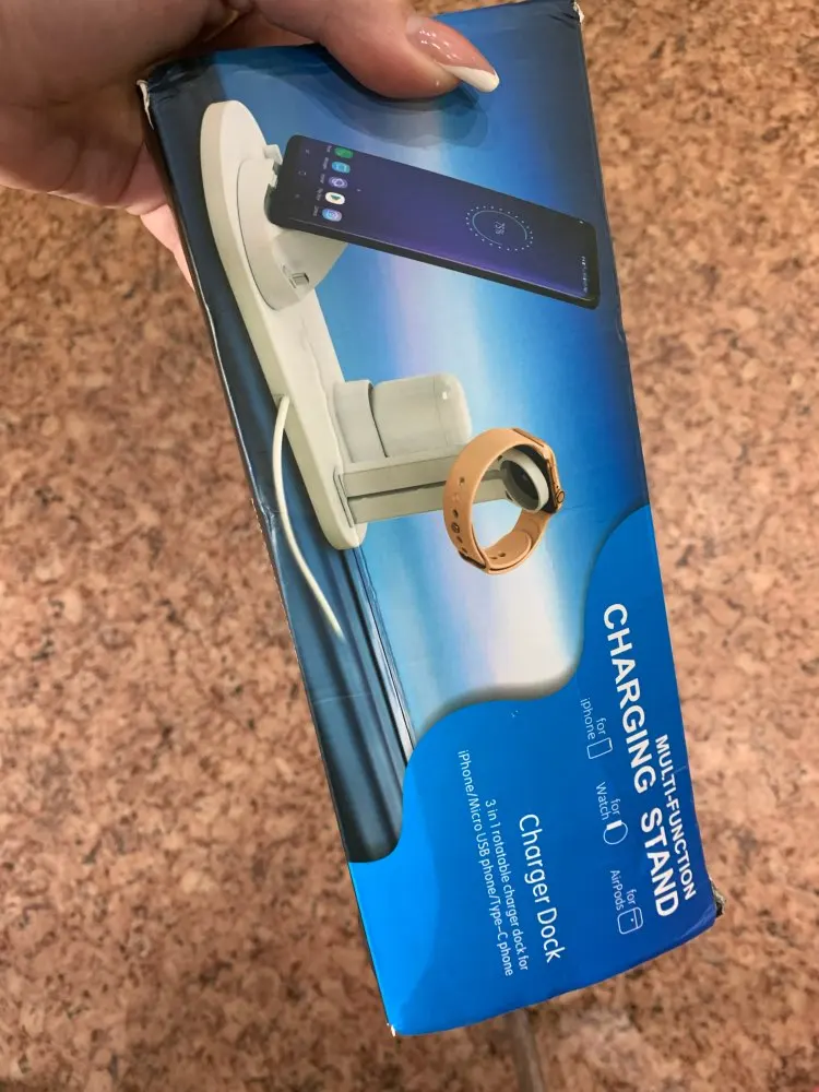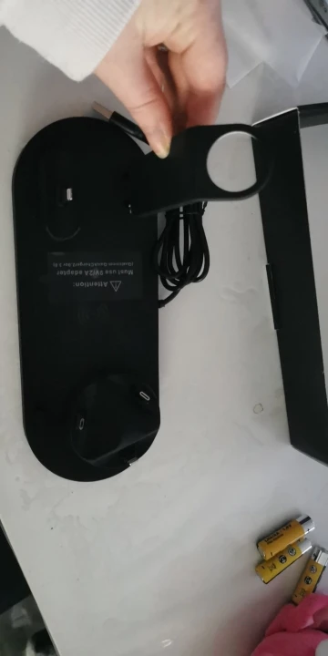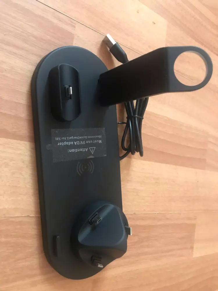 Упаковка была помята, но внутри всё уцелело. Собралось без проблем, пластик качественный, без запаха. Заряжает при полной загрузке, часы, телефон и наушники, долго. Нужно докупить адаптер большей мощности, об этом продавец предупреждает в описании.