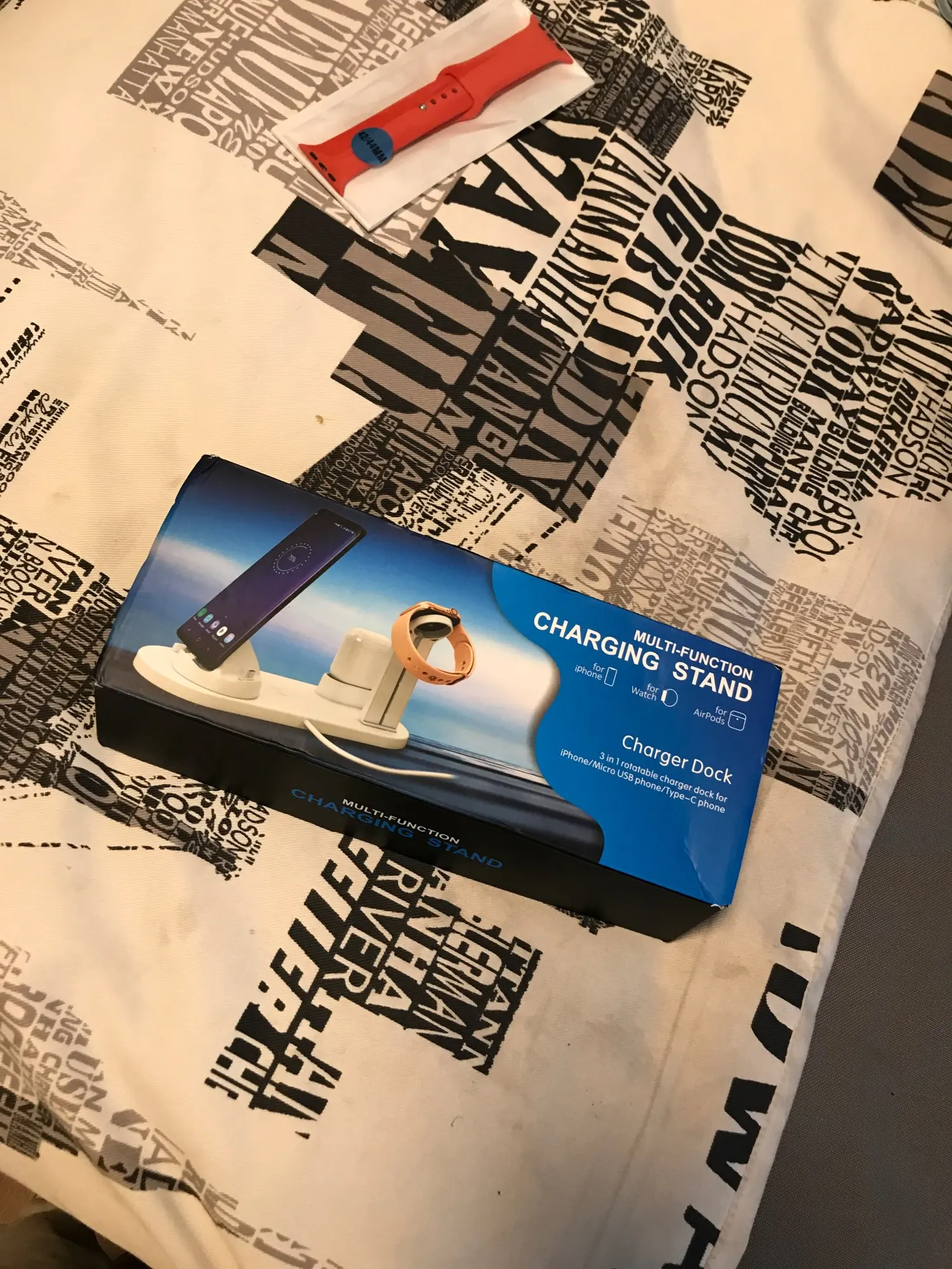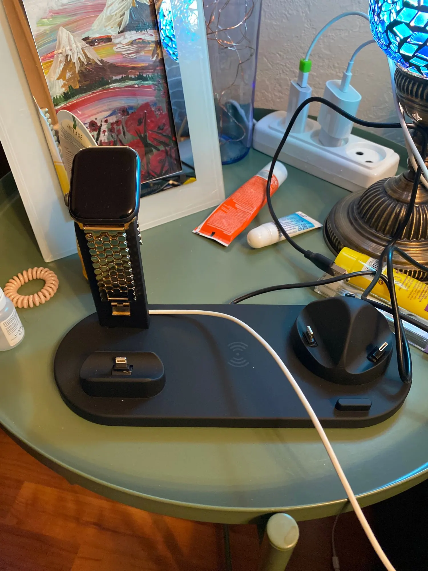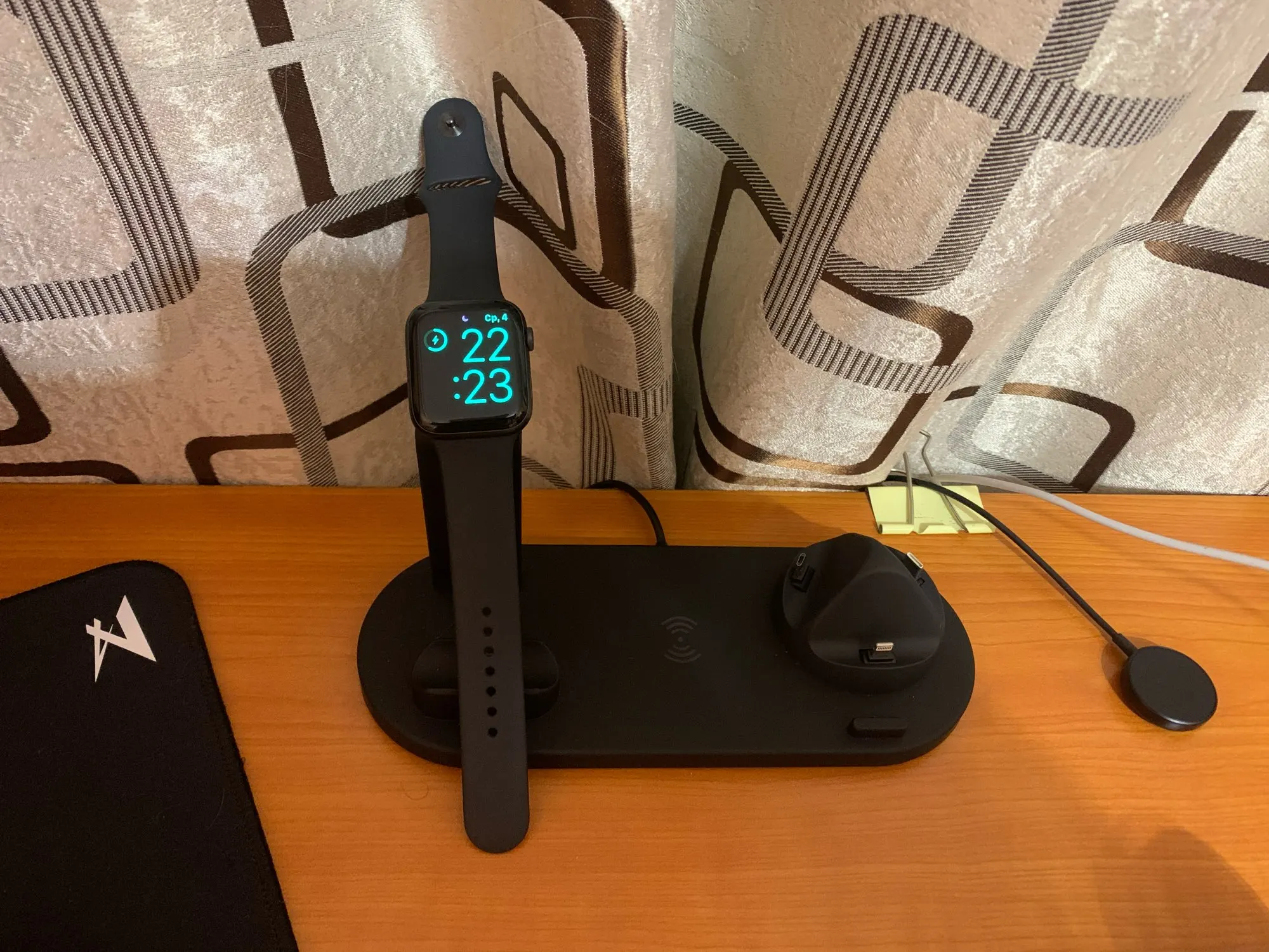 Неплохая зарядка, попала под хорошую акцию и выкупила ее за 600 с небольшим рублей. Единственное иногда отключается, но мне кажется проблема в вилке (в комплект не входит) и для зарядки часов нужно вставить свой шнур в подставку (на фото видно)