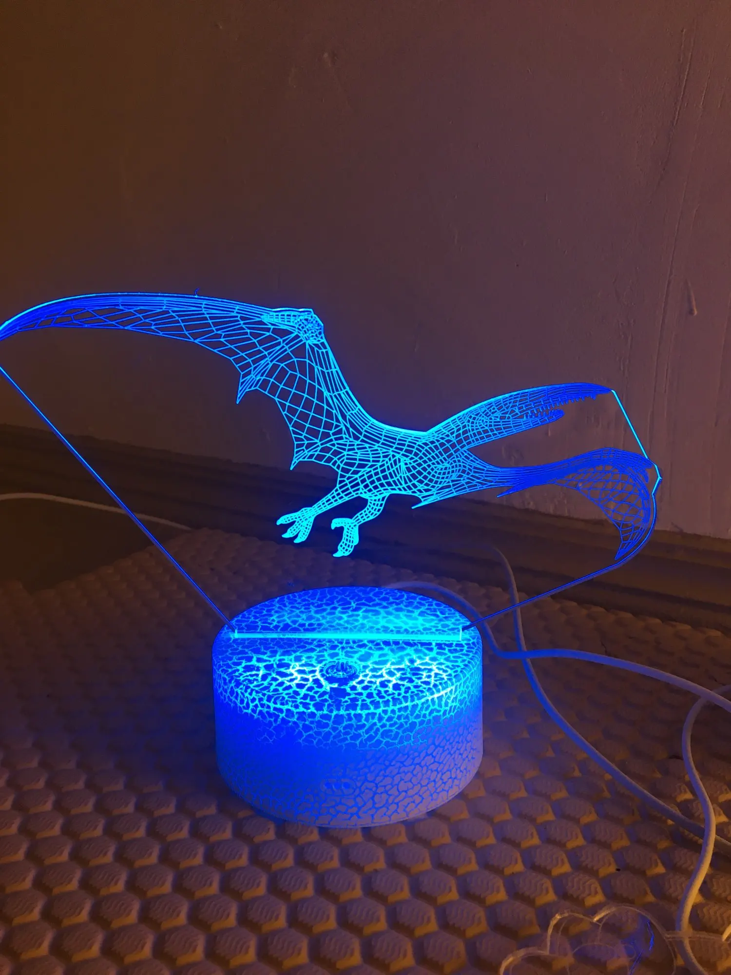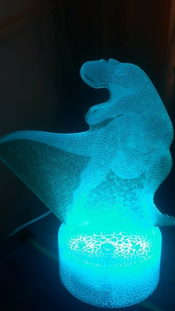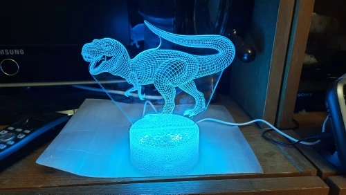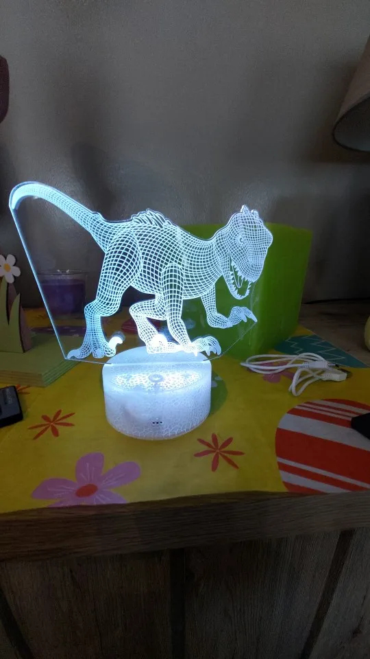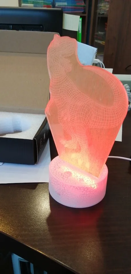 Заказ был оформлен 23.10, получила 11.12. Доставка платная, было написано, что доставка будет 14-28 дней. Продавец быстро отправил заказ. Работает от батареек 3 шт. Тип ААА, ИЛИ ОТ USB. Есть пуль, можно выбирать режимы на нём, а также можно выбирать режимы прикасаясь к панели. Светит ярко, цвета насыщенные. Заднюю пленку с динозавра не снимала. Рекомендую