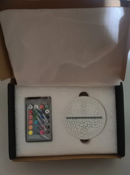 Он не очень большой, но, по правде говоря, мне он очень понравился. Может работать на аккумуляторе или проводом. Кабель должен быть подключен к обычному адаптеру питания usb типа mvl. Он поставляется с небольшим пультом дистанционного управления для изменения цвета или установки режимов. Без батарей, без управления, без лампы.