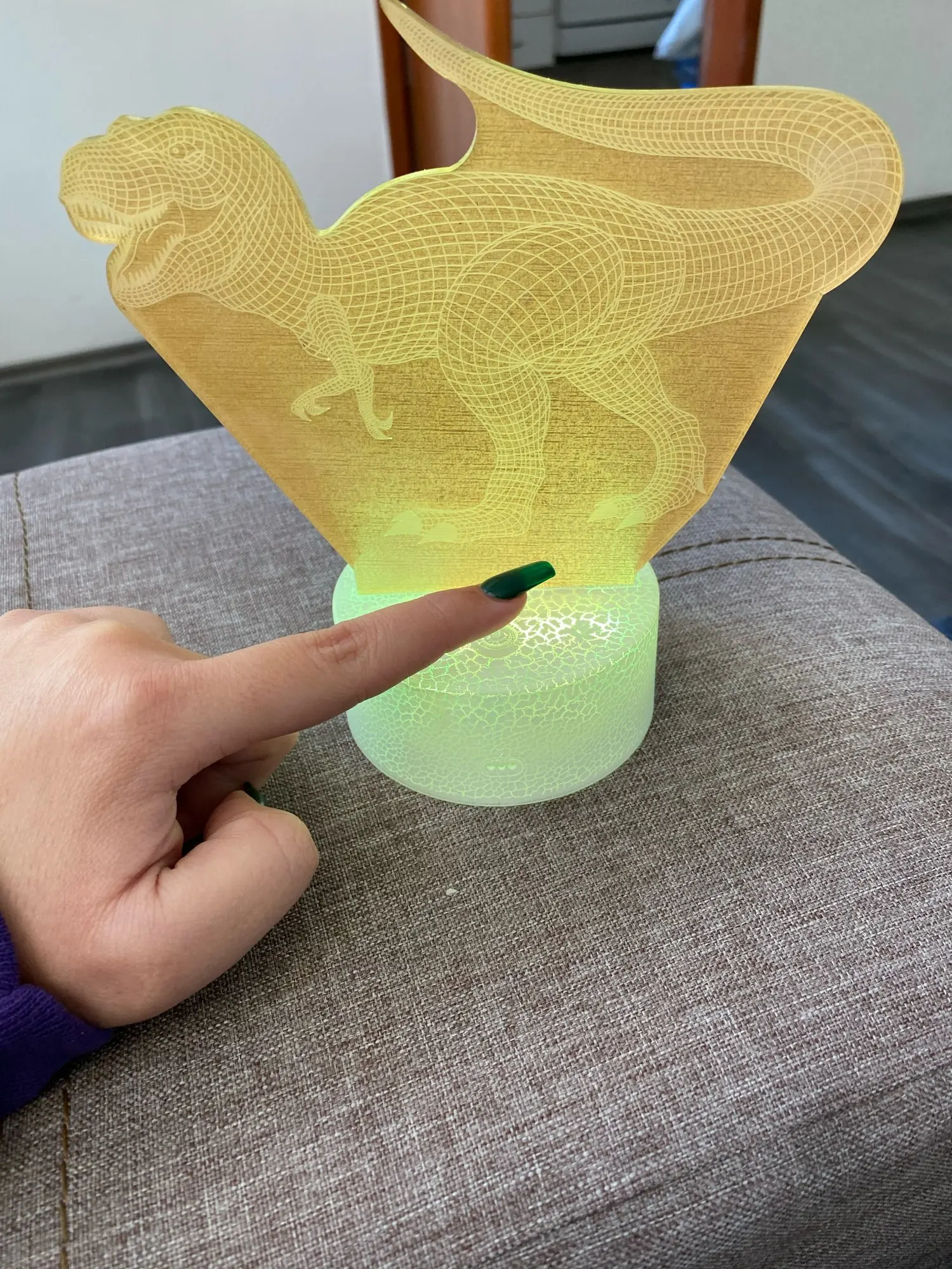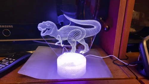 казалось что это 3d проекция, на самом деле же это подсвечивается плоский силуэт динозавра из орг стекла с гравировкой