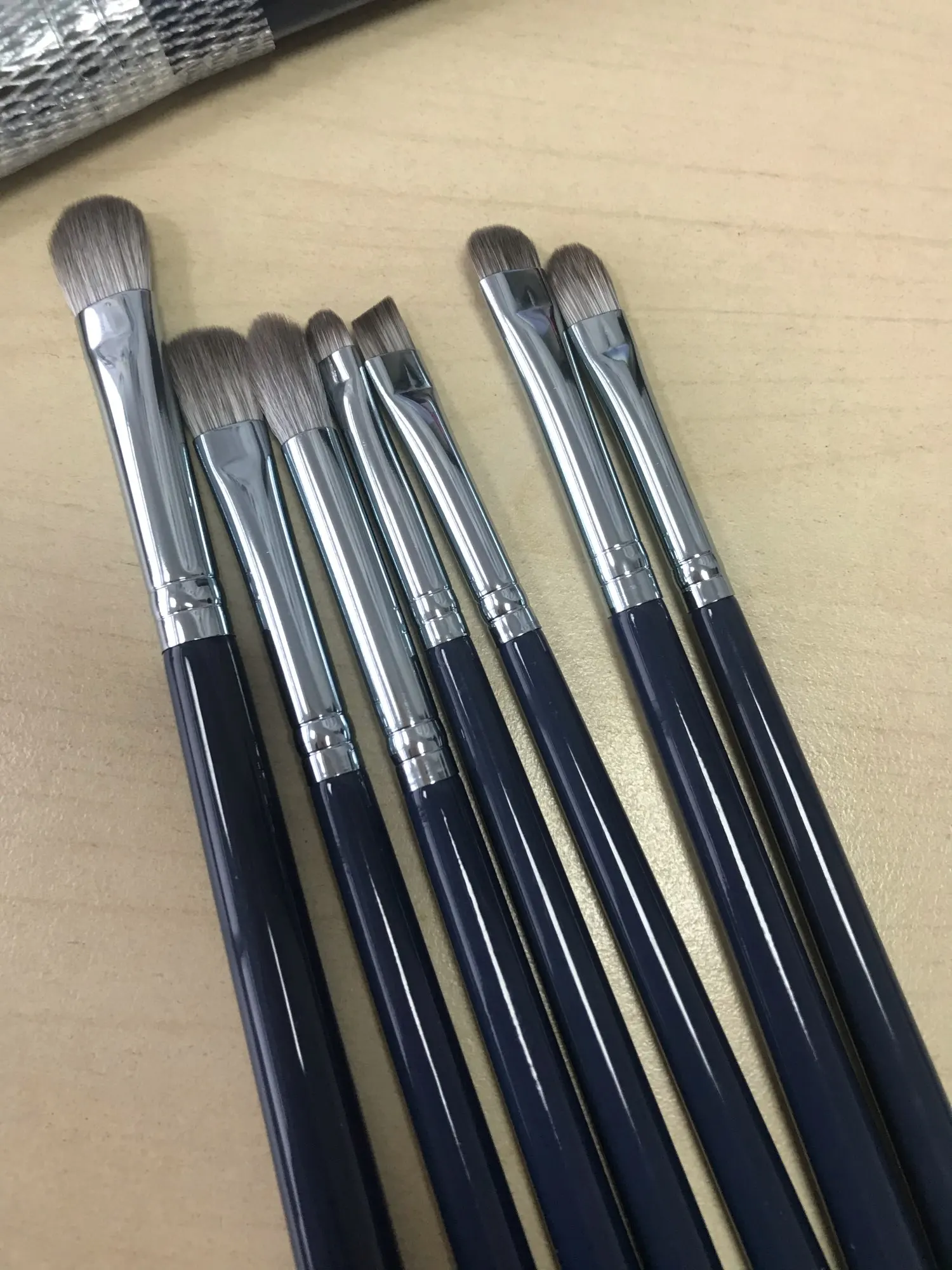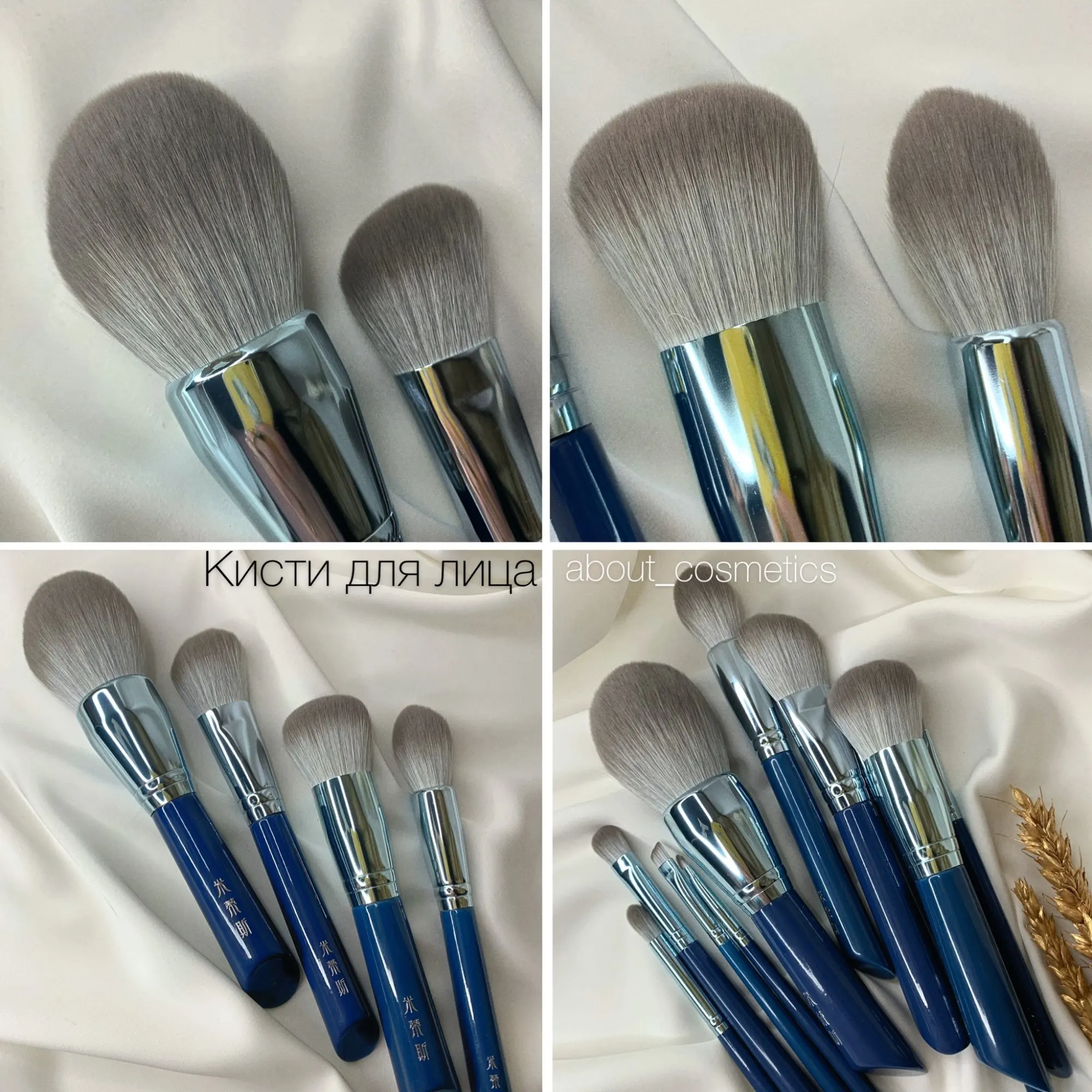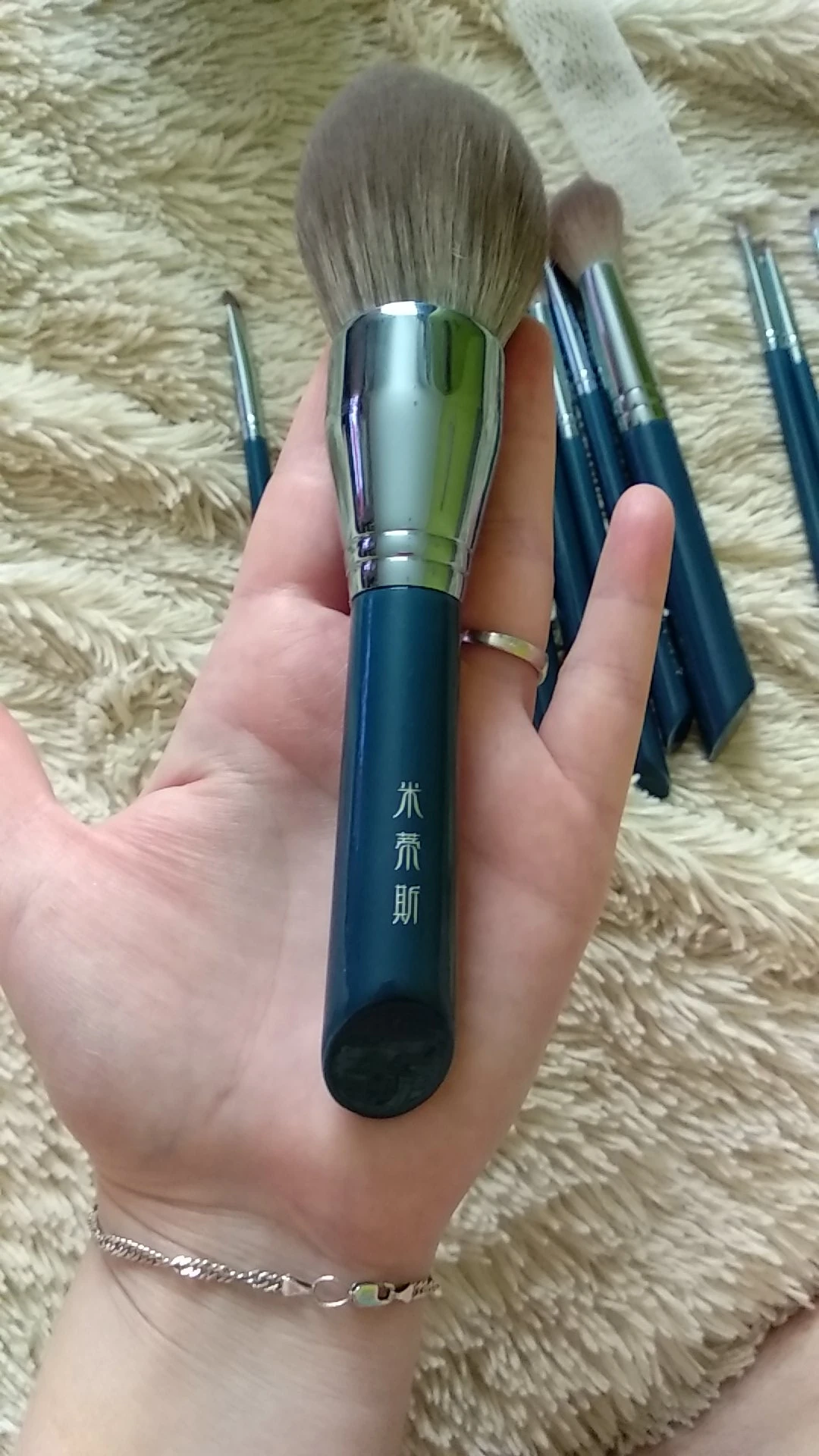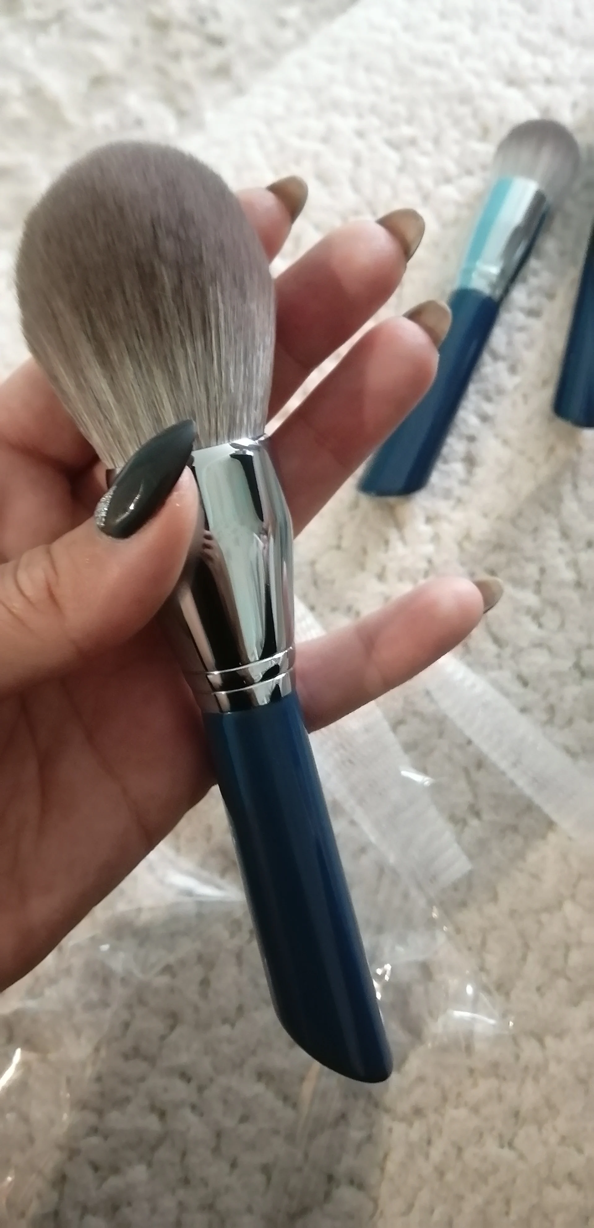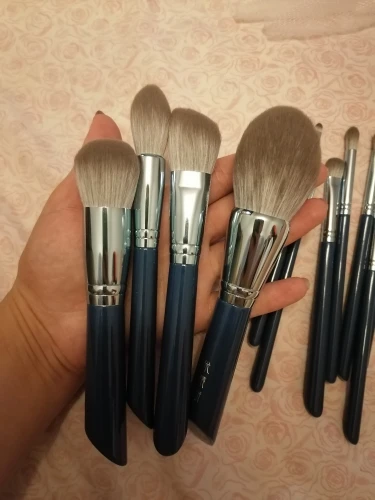 Заказывали второй раз, но на этот раз бронзовые. Кисти отличные - ушли на подарок. Именинница была в восторге)))) до этих заказывали темно-синие. Широкие кисти каждая в сеточке. После Мойке сушить только в них чтобы форма не расползлась. На руке и на веках чувствуются одинаково мягко без излишней жесткости. Продавца рекомендую ибо все доходит быстро и аккуратно упаковано!