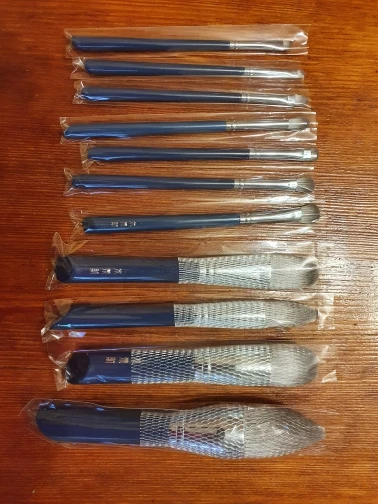 Упакованы хорошо, каждая кисть в отдельном пакетике. Очень мягкие и нежные. Резковатый запах "Китая", но думаю выветрится. 11 штук, как и написано. В нанесении буду смотреть. Пришли в Магнитогорск очень быстро (около недели).