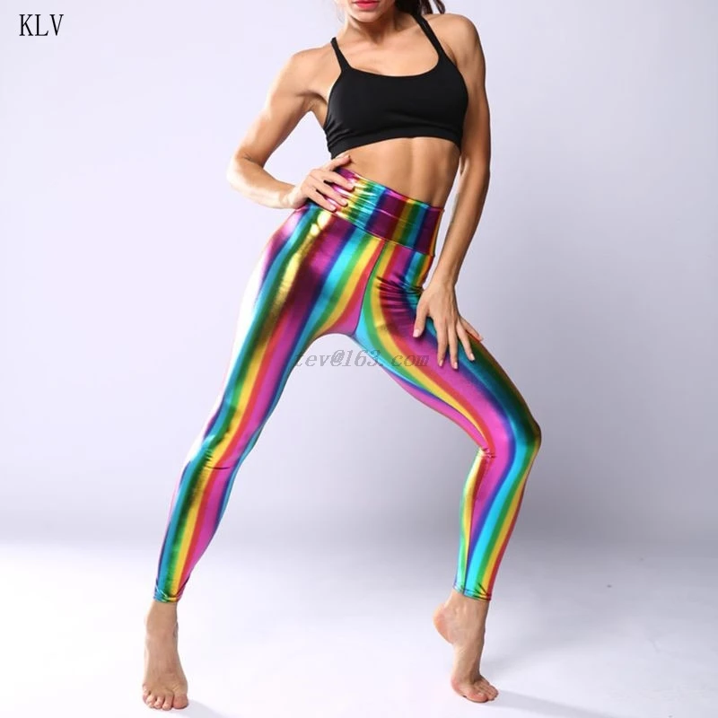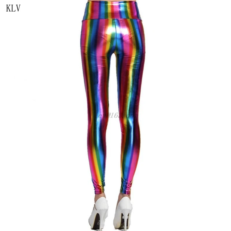 Женские леггинсы с голограммой Металлик Радуга блестящие неоновые колготки полосатые штаны для йоги с высокой талией вечерняя Клубная одежда из искусственной кожи