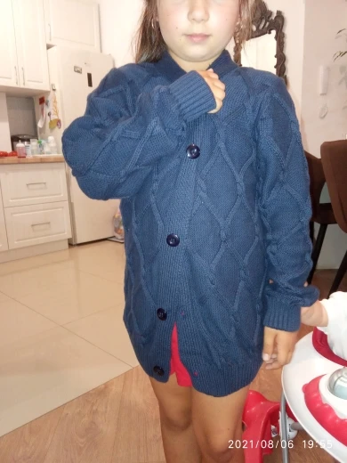 Кофта машинной вязки, размер 10 на ребенка 130 см. Не такая плотная как на фото продавца. Без брака.
