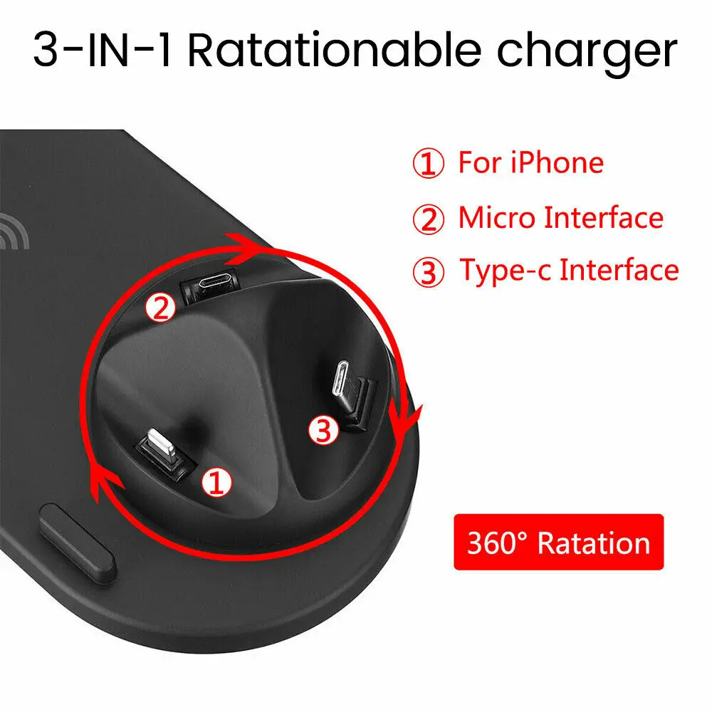 Беспроводное зарядное устройство 4 в 1: многофункциональная Подставка для зарядки с интерфейсами IOS/Micro/Type-C может заряжать почти все мобильные устройства, такие как iPhone, iPad, Samsung, LG, зарядная док-станция HTC, Huawei, Sony может свободно вращаться на 360 градусов.