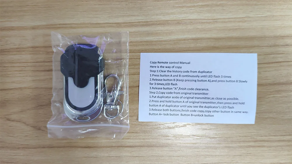 Скопируйте ваш оригинальный пульт дистанционного управления лицом к лицуШаг 1: Очистите код истории от дубликатора1. Нажмите кнопку A и B непрерывно, пока светодиодный индикатор не начнет мигать 3 раза2. Кнопка спуска B (удерживайте нажатие кнопки A) и медленно нажимайте кнопку B 3 раза, светодиодный фонарик3. Отпустите кнопку «A», завершите оформление кода.Шаг 2, Скопируйте код с оригинального передатчика1. Отложите Дубликатор в сторону оригинального передатчика, как можно ближе.2. Нажмите и удерживайте кнопку A оригинального передатчика, затем нажмите и удерживайте кнопку A дубликатора, пока не увидите светодиодный фонарик дубликатора3. Отпустите обе кнопки, завершите копирование кода, скопируйте другую кнопку таким же образом.Кнопка A = кнопка блокировки B = кнопка разблокировки
