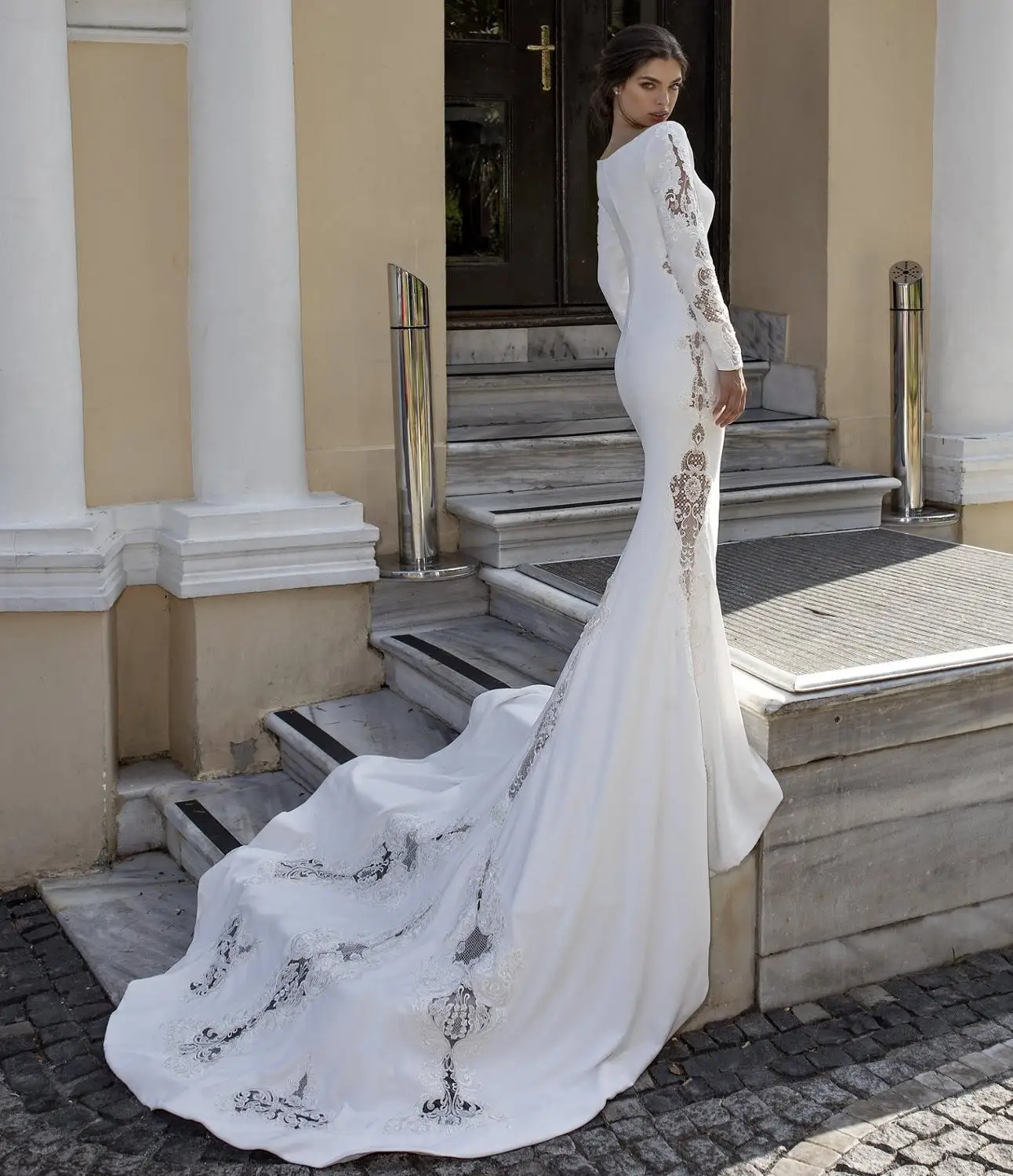 Новинка 2020, свадебное платье, украшенное драгоценными камнями, с длинными рукавами, кружевное женское свадебное платье с юбкой-годе и шлейфом на заказ