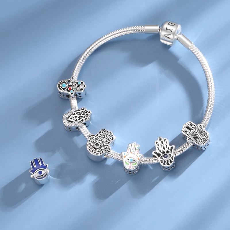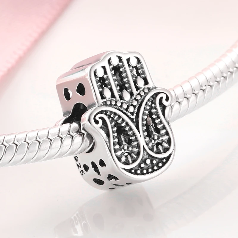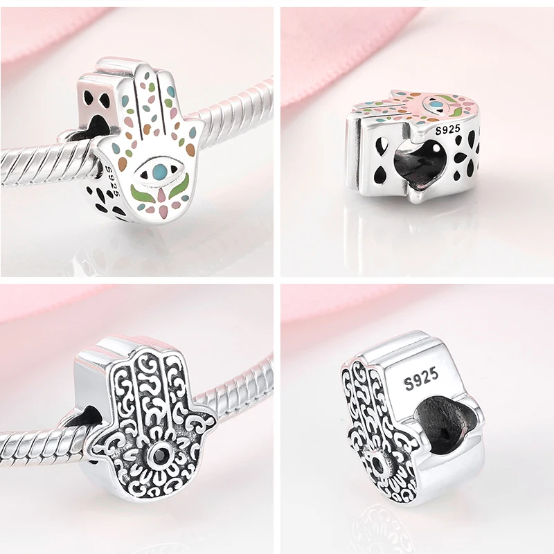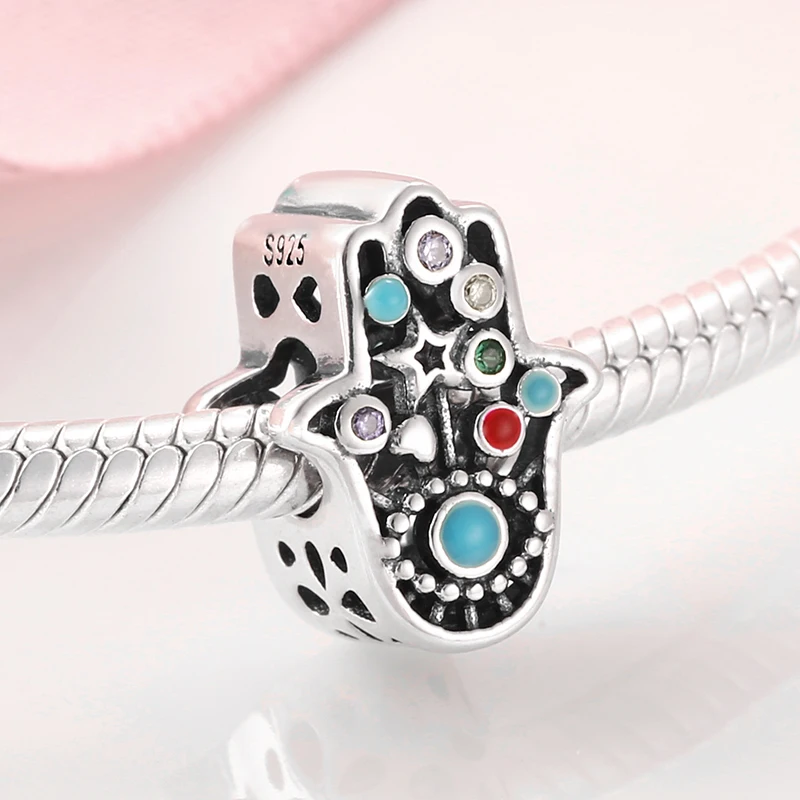 925 пробы серебро Очаровательный узор Лаки рука Фатимы, цветной CZ бусины, подходят к оригиналу Pandora, очаровательный Браслеты ювелирных изделий