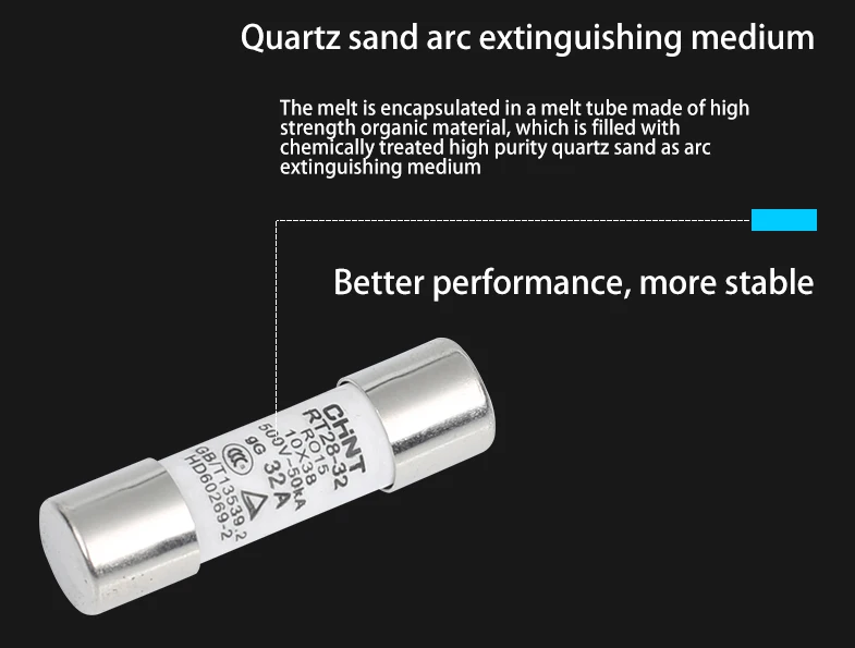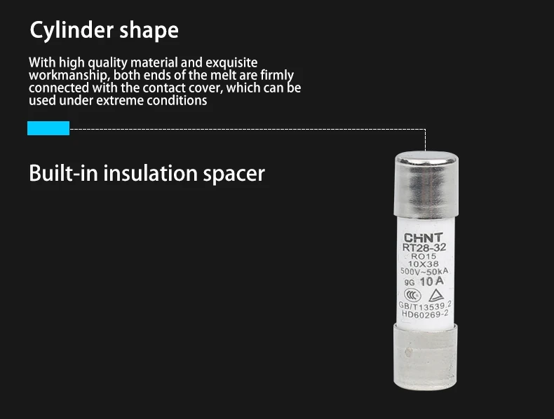 1. Электрические характеристики: AC380V/500V, до 125A; 2. Применение: для защиты устройства распределения электроэнергии от перегрузки и короткого замыкания; 3. Взрывобезопасное устройство (код "X") предохранителя Разъём состоит из неоновой лампы и сопротивления; 4. Стандарт: IEC 60269.