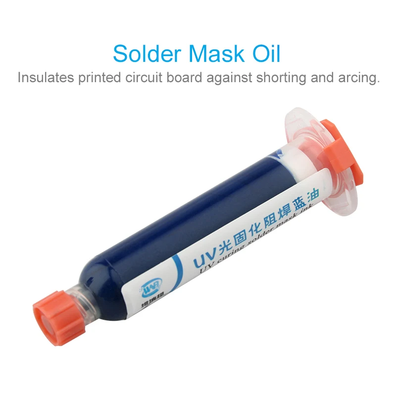 10CC синий УФ-светильник для отверждения BGA печатная плата паяльная маска чернила сварочная масляная краска предотвращает коррозионную арку Информация о продукте: Материал: акриловые олигомеров Диэлектрическая прочность: >500 в/мил Устойчивость к растворению: трихлорэтан варится в течение 2 минут без падения Сопротивление припоя: 255-265 градусов 10s * 3 раза Твердость: >5H Состояние отверждения: УФ-светильник Ёмкость: 10cc Применение: печатная плата для ремонта основных материалов Особенности: 1. Синее масло, жидкое фото припоя, является акриловым олигомером. 2. Из-за особого характера материала масло для паяльной маски не высыхает естественным образом. Требуется УФ-отверждение. 3. В качестве защитного слоя он наносится на цепь и подложку, на которой печатная плата не должна быть паяна или использована в качестве припоя. 4. Цель заключается в защите формованной линии в течение длительного времени. Промышленное применение: 1. Предотвращает физическое отключение цепи проводника. 2. В процессе сварки предотвращается короткое замыкание, вызванное мостом. 3. Сварка только в частях, которые должны быть сварены, чтобы избежать отходов припоя. 4. Уменьшение медного загрязнения желобка для сварки. 5. Предотвращает износ и коррозию изоляции из-за внешних факторов окружающей среды, таких как пыль и влагу. 6. Он имеет высокую изоляцию и позволяет увеличить плотность цепи.