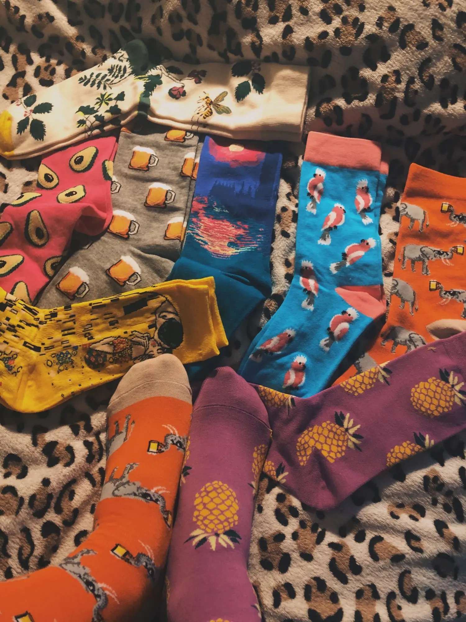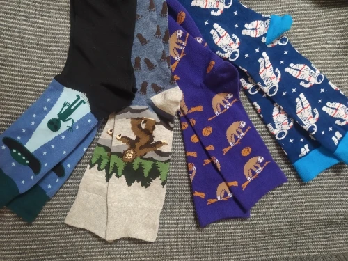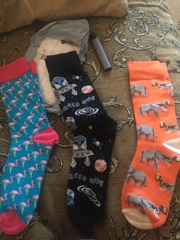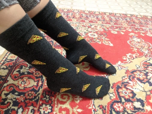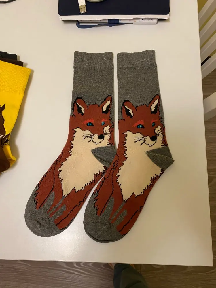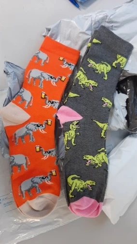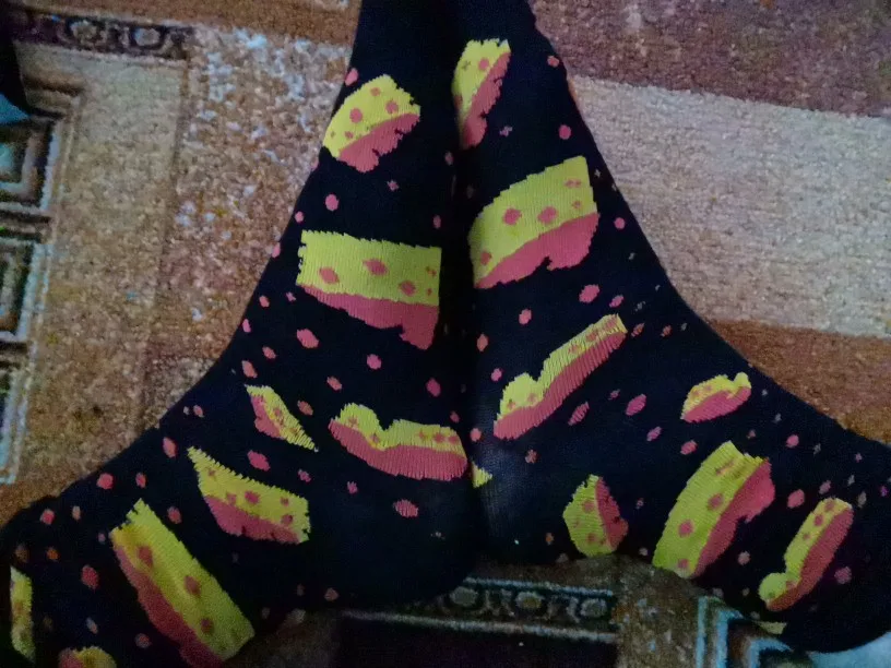 Яркие, тянутся хорошо, выглядят качественно) Носки со слоном в очках, держащим пиво, особенно восхитительны! Когда нас вернут в офис, буду там самой модной мамзелей Правда, вместо носков с пиццами мне положили с рыболовными снастями, но зато мужики точно за свою примут.