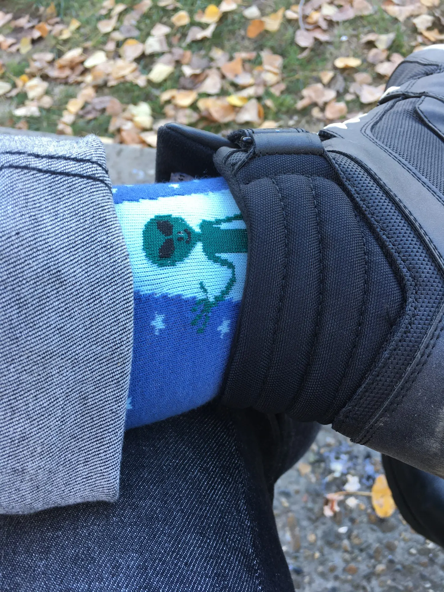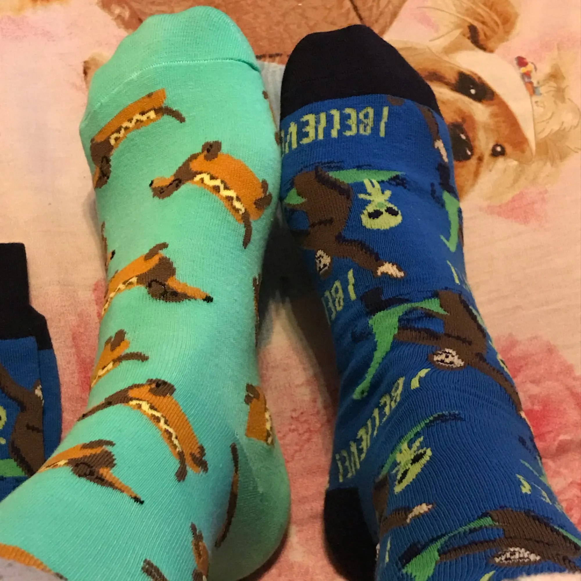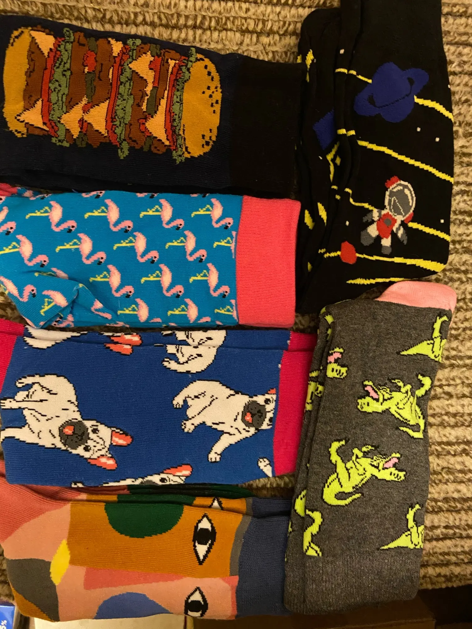 Яркие, тянутся хорошо, выглядят качественно) Носки со слоном в очках, держащим пиво, особенно восхитительны! Когда нас вернут в офис, буду там самой модной мамзелей Правда, вместо носков с пиццами мне положили с рыболовными снастями, но зато мужики точно за свою примут.