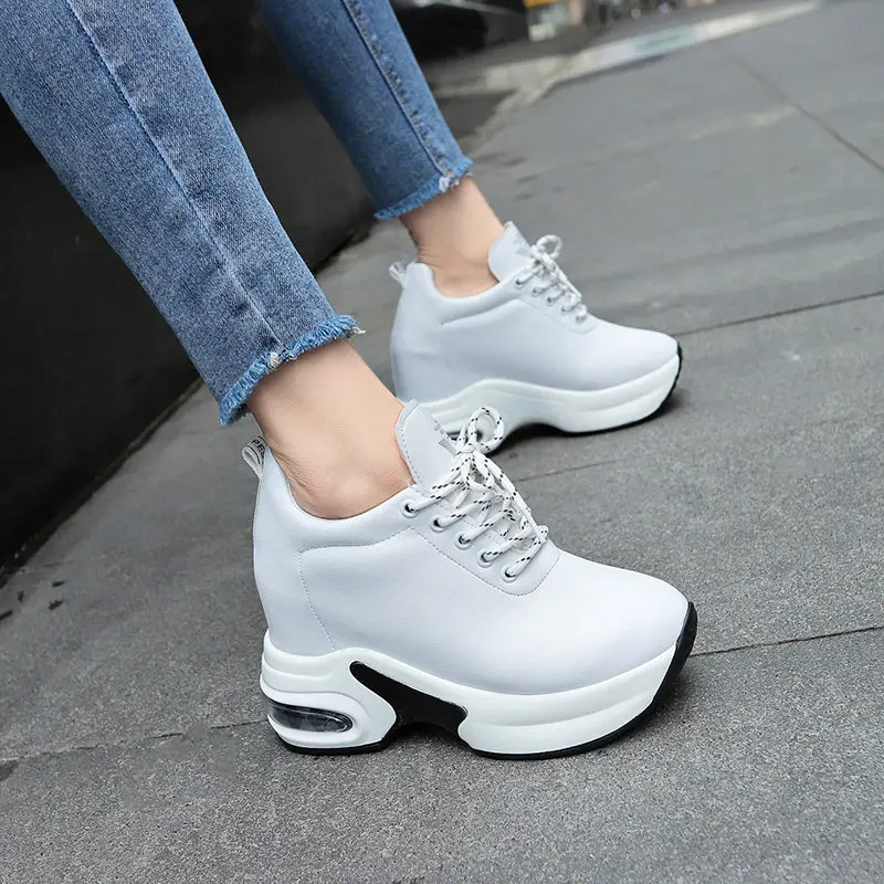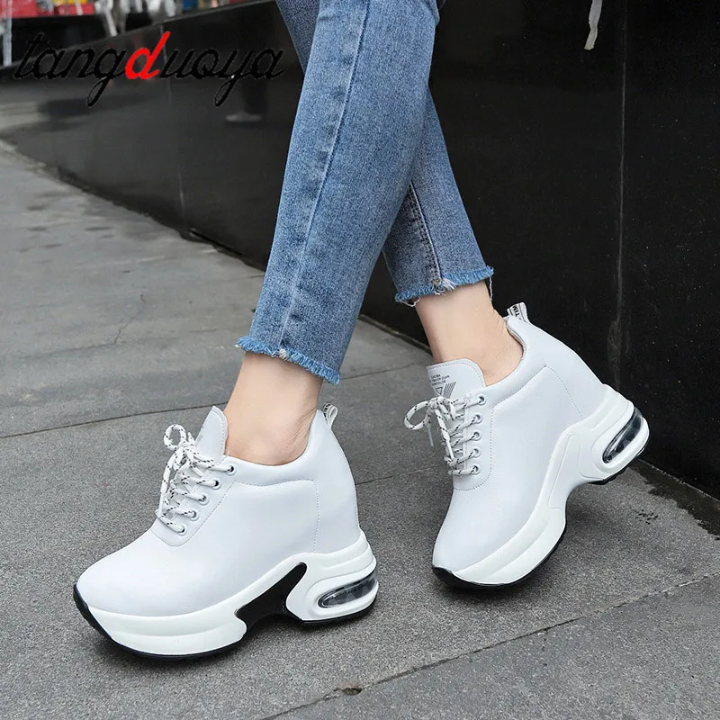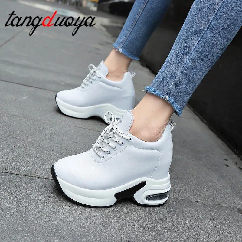 Женская повседневная обувь на платформе на высоком каблуке, белые кроссовки на танкетке, визуально увеличивающие рост, на осень, 2019