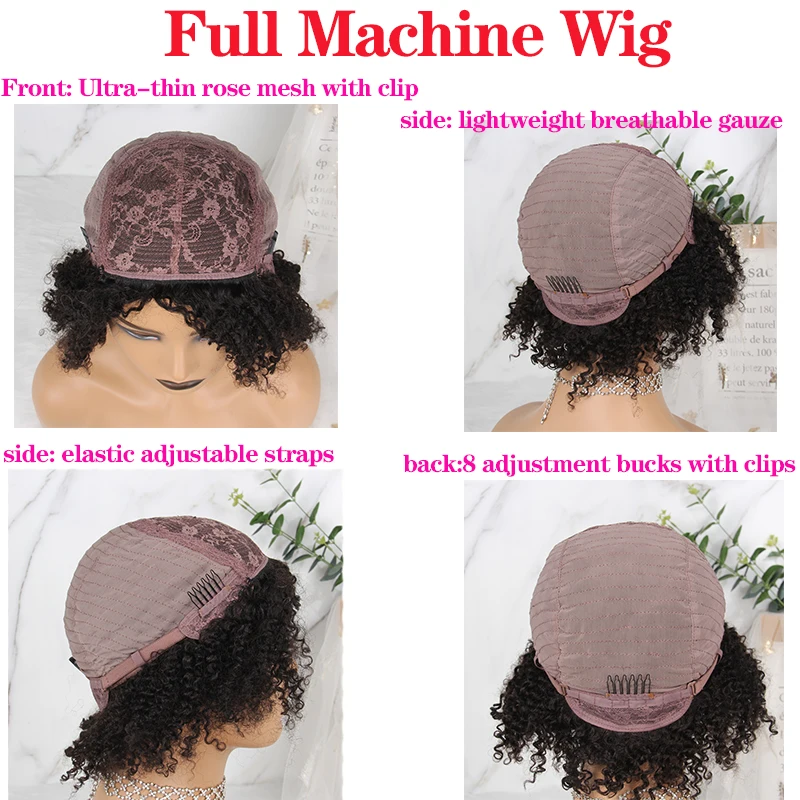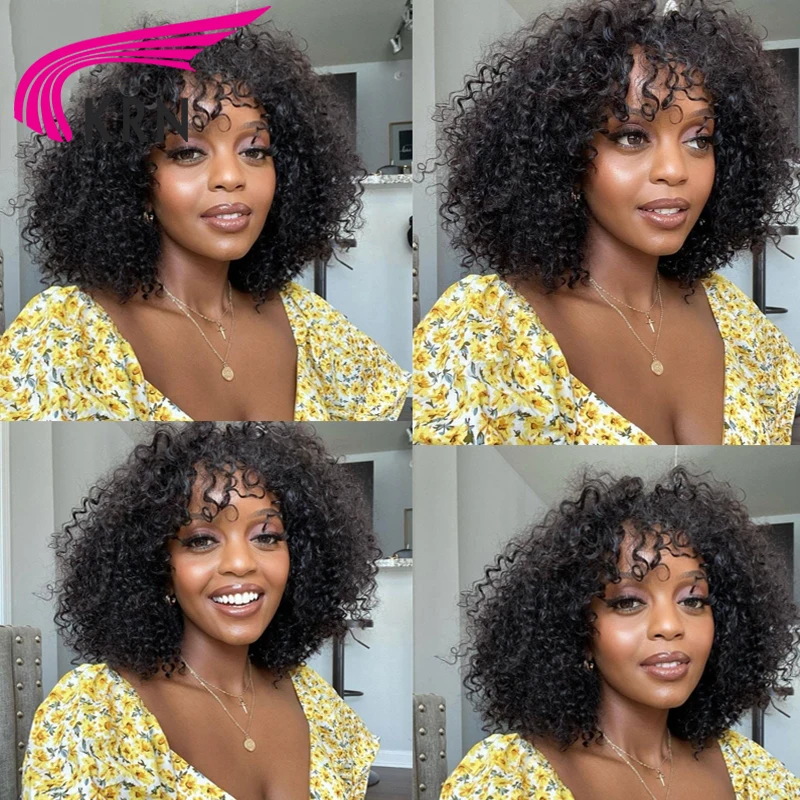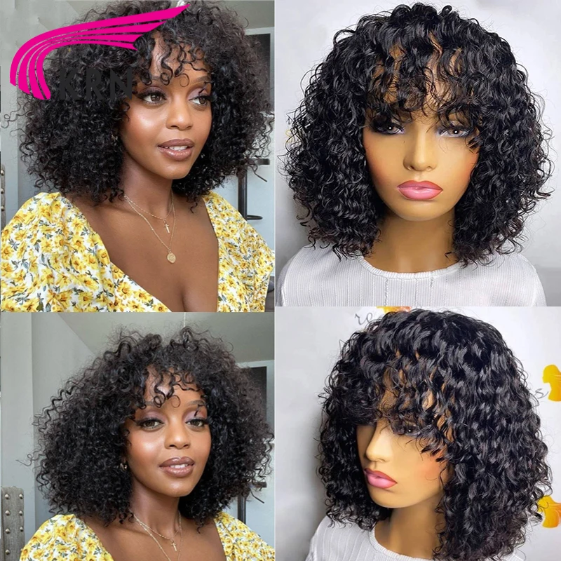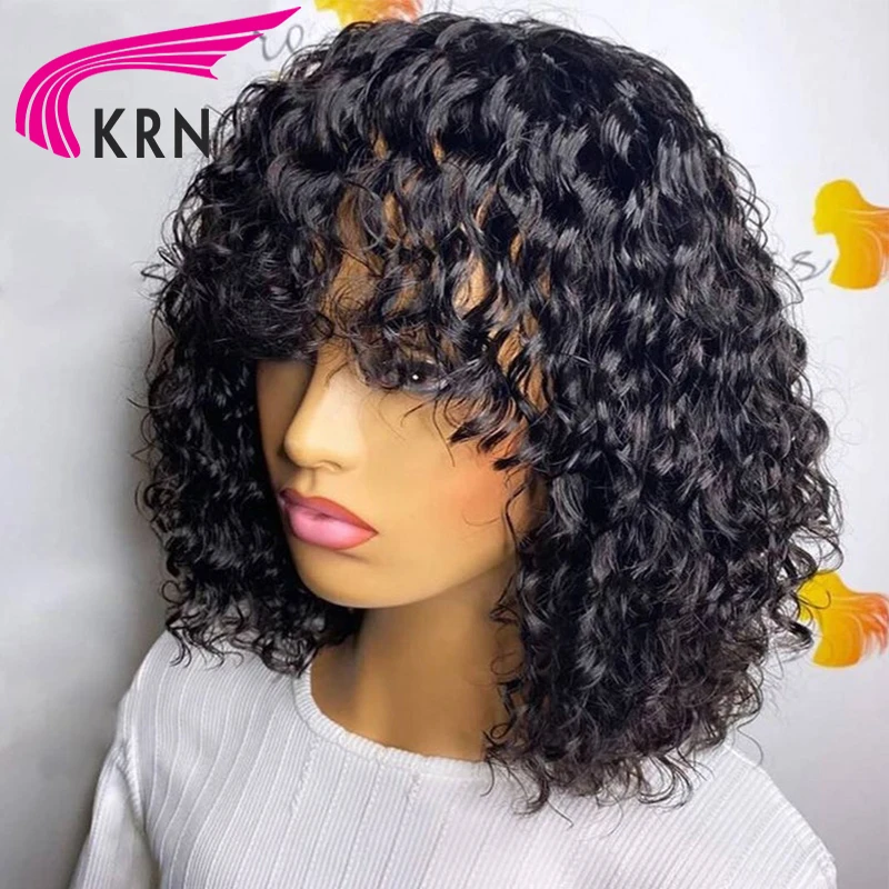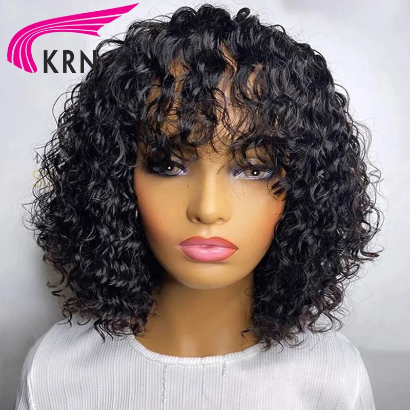 Бразильские короткие вьющиеся человеческие волосы, парики с челкой, 180% Реми, без клея, полностью машинное изготовление, парики из человеческих волос для женщин