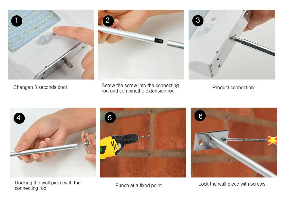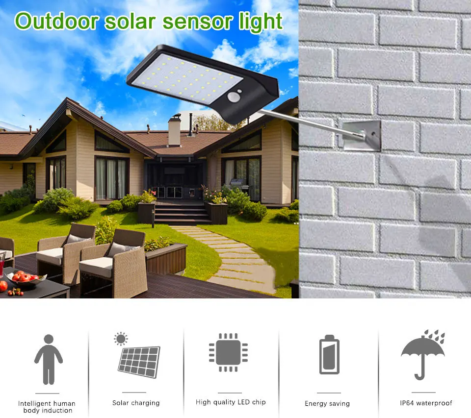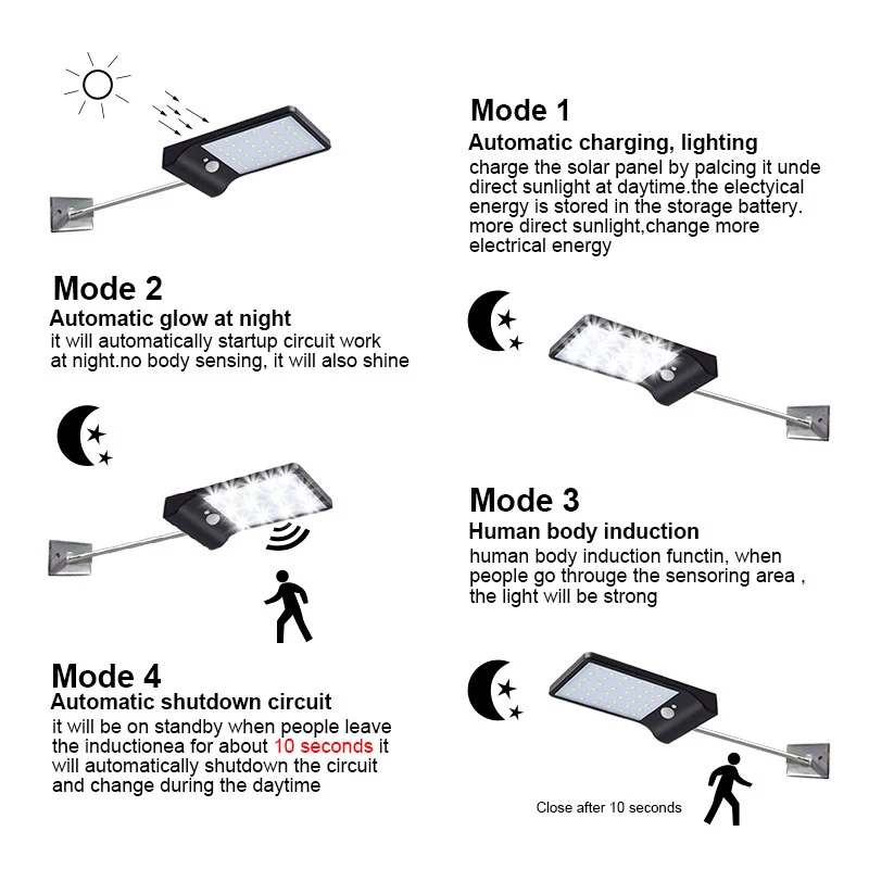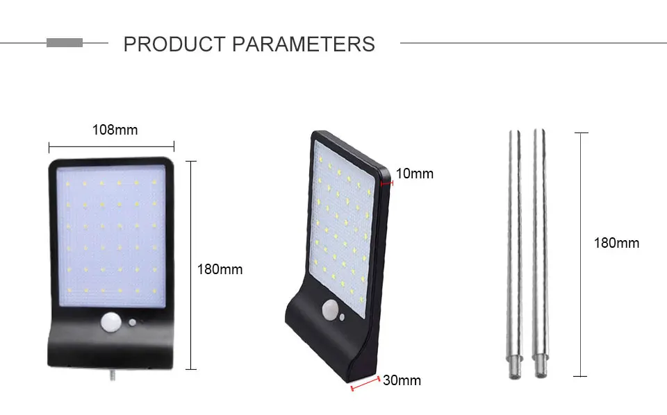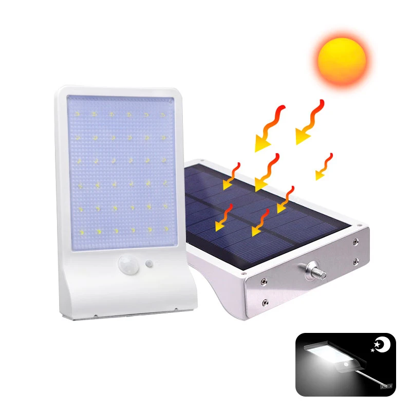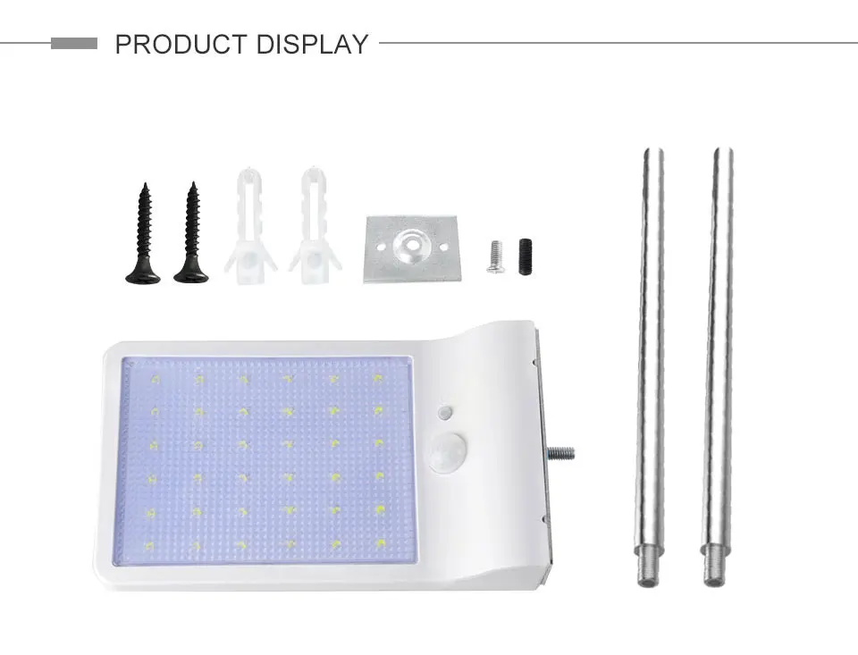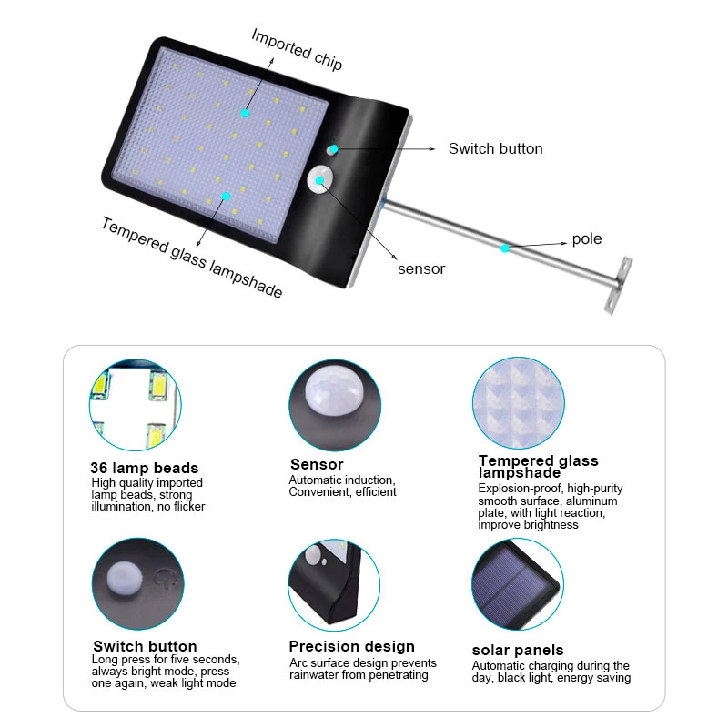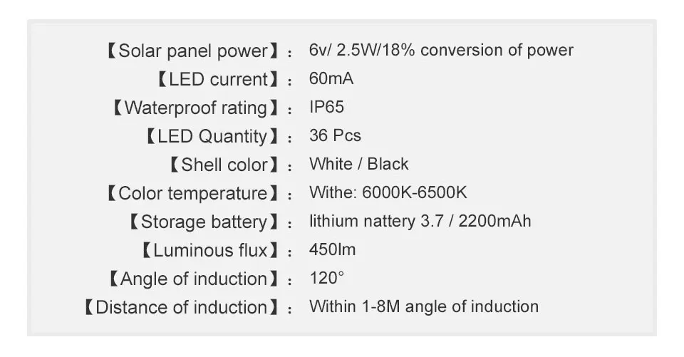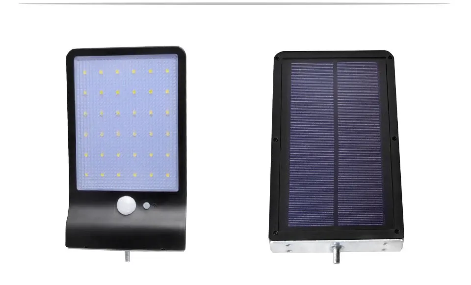Особенности:1. Более высокая энергоэффективность: Высокая энергоэффективность, коэффициент конверсии энергии может достигать 20%.2. Датчик на светильник: встроенный датчик на светильник, он автоматически включается в темноте или ночью и выключается в дневное или яркое время.3. Долгое время работы: с 36 светодиодами его яркость до 450lm, встроенный аккумулятор 2200mAh, для полной зарядки требуется всего 6-8 часов и может работать 8-10 часов.4. Конструкция защиты: внешний водонепроницаемый переключатель, легко работает, водонепроницаемость IP65 и материал из нержавеющей стали делают его пригодным для использования на открытом воздухе. Он может эффективно изолировать воду и туман.Спецификация:-- Светодиодный: 36 шт. светодиодный s-Светильник; Цвет: белый-Солнечная панель: 6V 60ma-- Аккумулятор: 2200 мАч-Уровень водонепроницаемости: IP65-Цвет корпуса: белый, черный-- Время работы: 8-10 часов-- Материал: алюминий и АБС-пластик