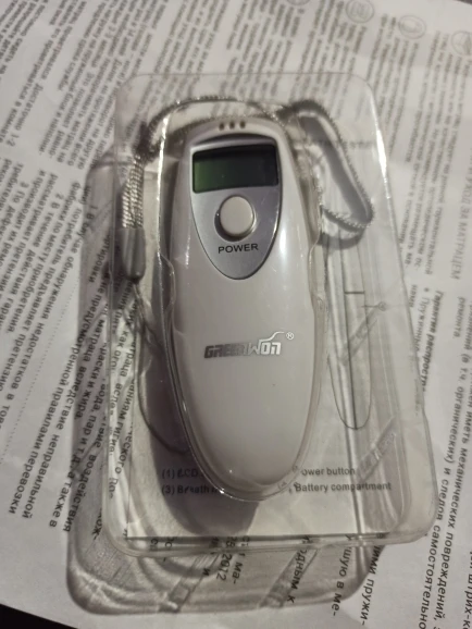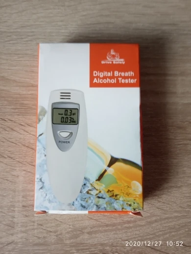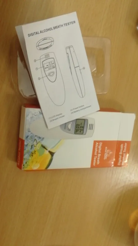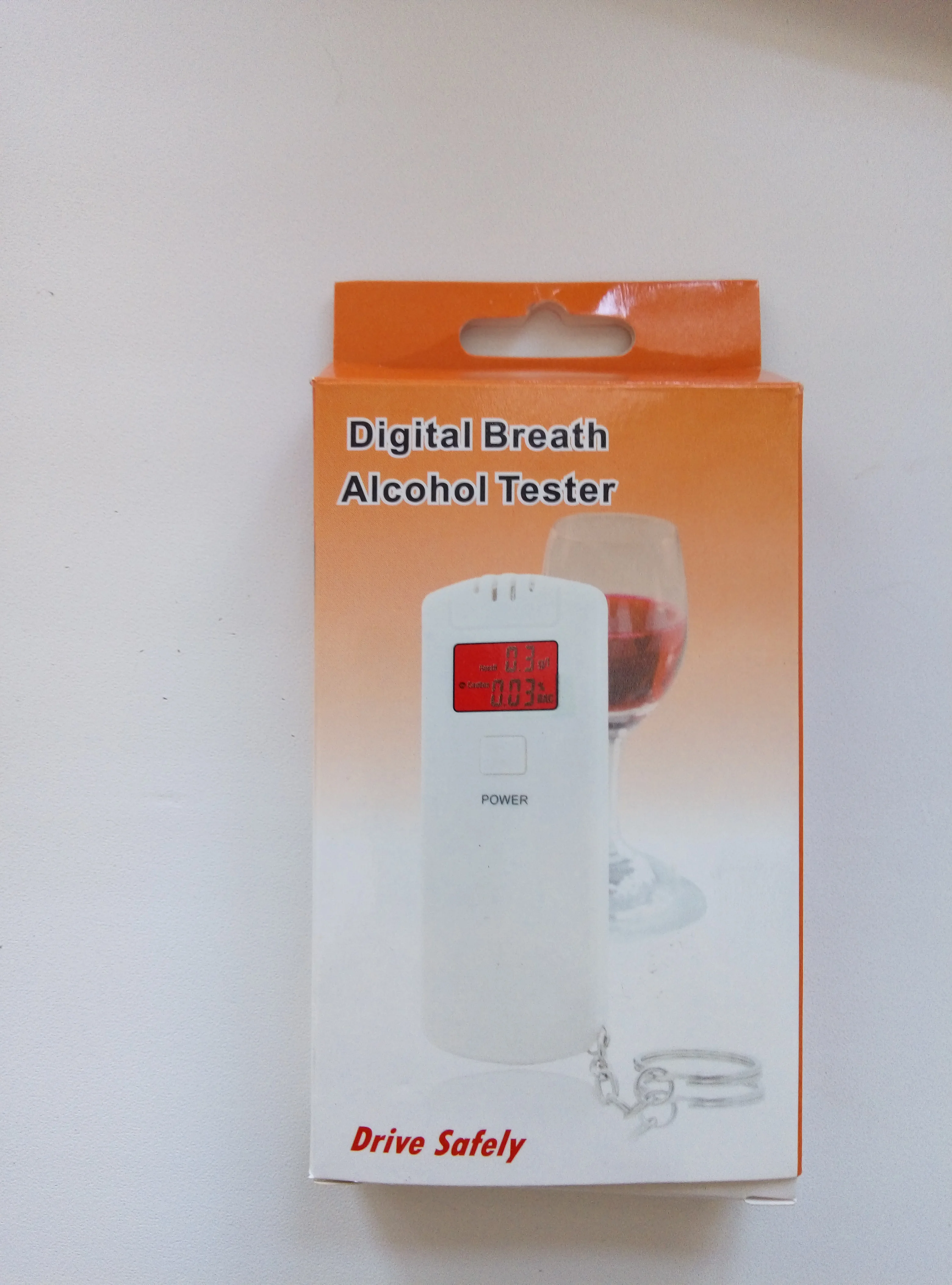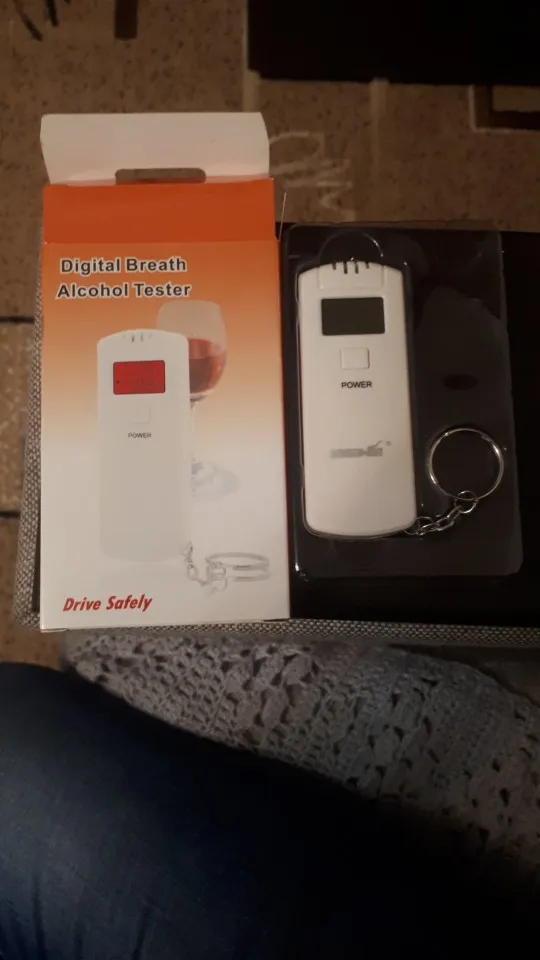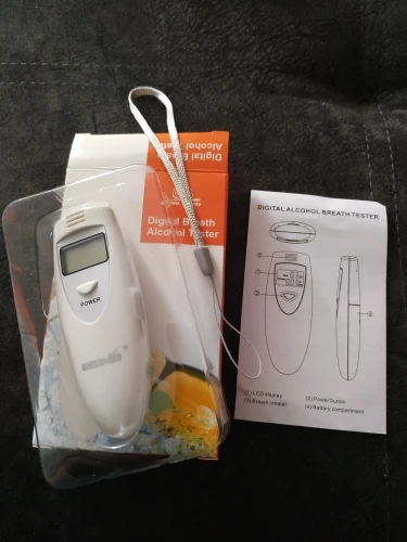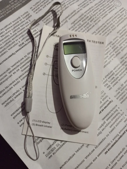 Посылка до Литвы пришла быстро за 15 дней. Товар Не поврежден. Прибыл в коробке. Имеется инструкция и ремешок. Прибор небольшой. В прибор нужны пальчиковые батарейки, в наборе не идут. При вдувании экран запотевает. Пробывала трезвой, показывал 0.00. Брала за 1,73€.