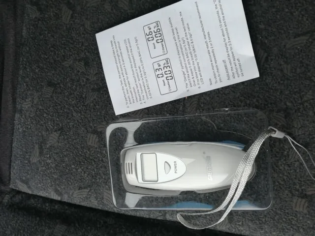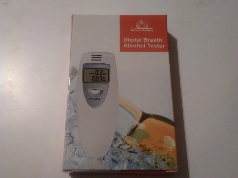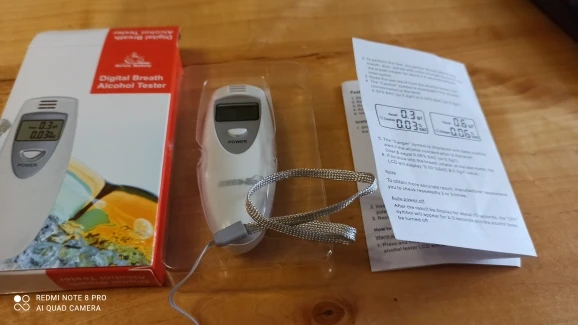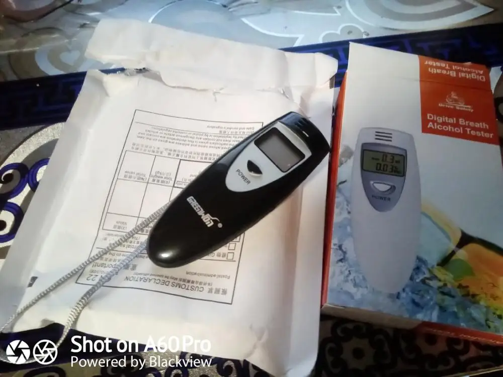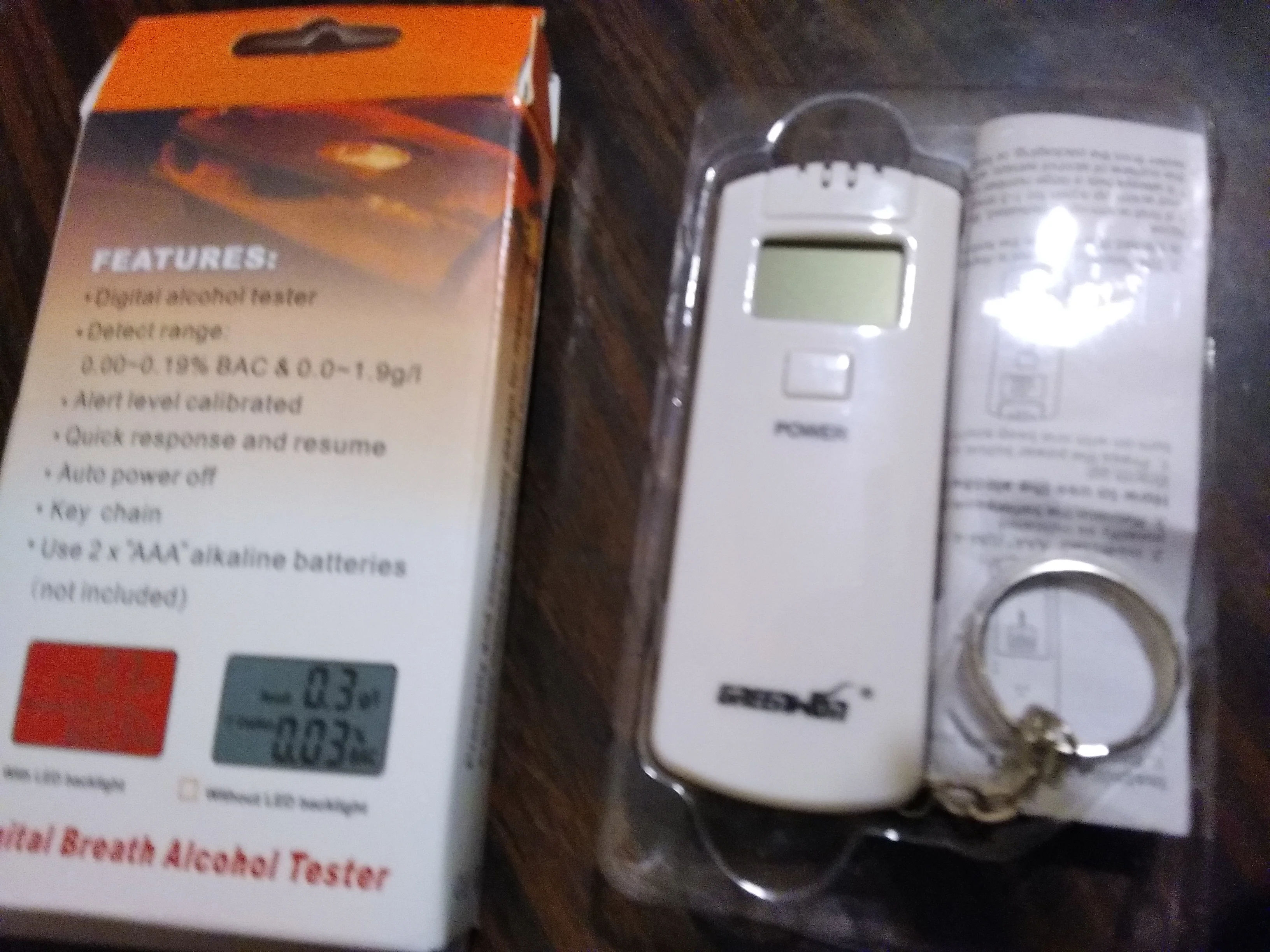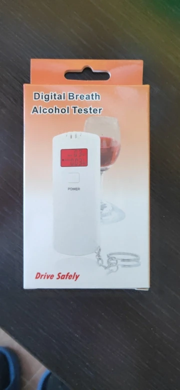 Посылка до Литвы пришла быстро за 15 дней. Товар Не поврежден. Прибыл в коробке. Имеется инструкция и ремешок. Прибор небольшой. В прибор нужны пальчиковые батарейки, в наборе не идут. При вдувании экран запотевает. Пробывала трезвой, показывал 0.00. Брала за 1,73€.