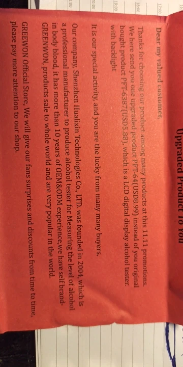 пришел быстро,обогнал все,что заказывал ранее,другие товары ещё в пути где то,пришел правда другого типа с часами подсветкой и градусником ,он по идеи дороже в два раза почти,чем который на картинке,незнаю насколько точен показывает 0, но я же трезвый,не пил,мне досталось за 125 рублей с купоном на распродажах,запотел сильно когда тестировал,но тестировал на улице,погода плохая была,влажно,прохладно и мокро,ещё непонравилось,что в заде имеются мелкие царапины,хотя в новой упаковки,незнаю почему так,может щупал ранее кто его,а в целом вроде новый,ладно за такую цену прощаю,главное чтобы работал хорошо,к продавцу небуду иметь притезий и портить оценки,сейчас день доставать его,царапины фоткать,при пользовании добавлю отзывы,как он работает,когда буду нетрезвый)