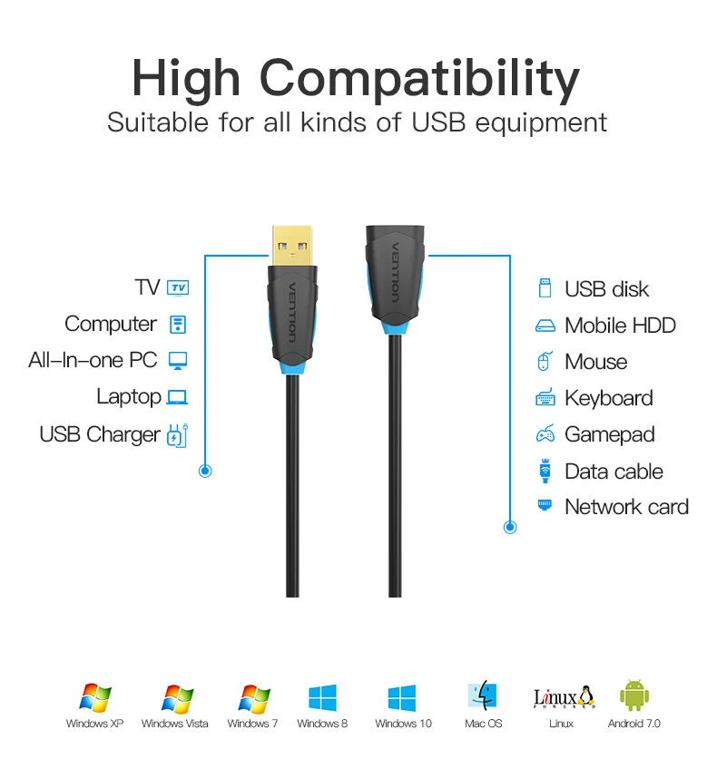 Vention USB 2,0 Удлинительный кабель, сверхскоростной USB кабель для передачи данных, удлинитель для ПК, клавиатуры, принтера, мыши, компьютерный кабель