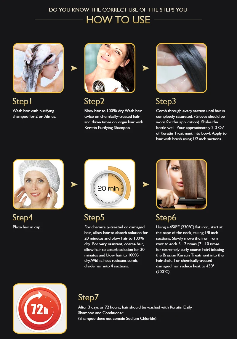 5. Для химически обработанных поврежденных волос дайте волосам впитать раствор в течение 20 минут и высушите волосы на 100%. Для каждого стойкого и грубого волоса дайте волосам впитать раствор в течение 30 минут и высушите волосы на 100%.