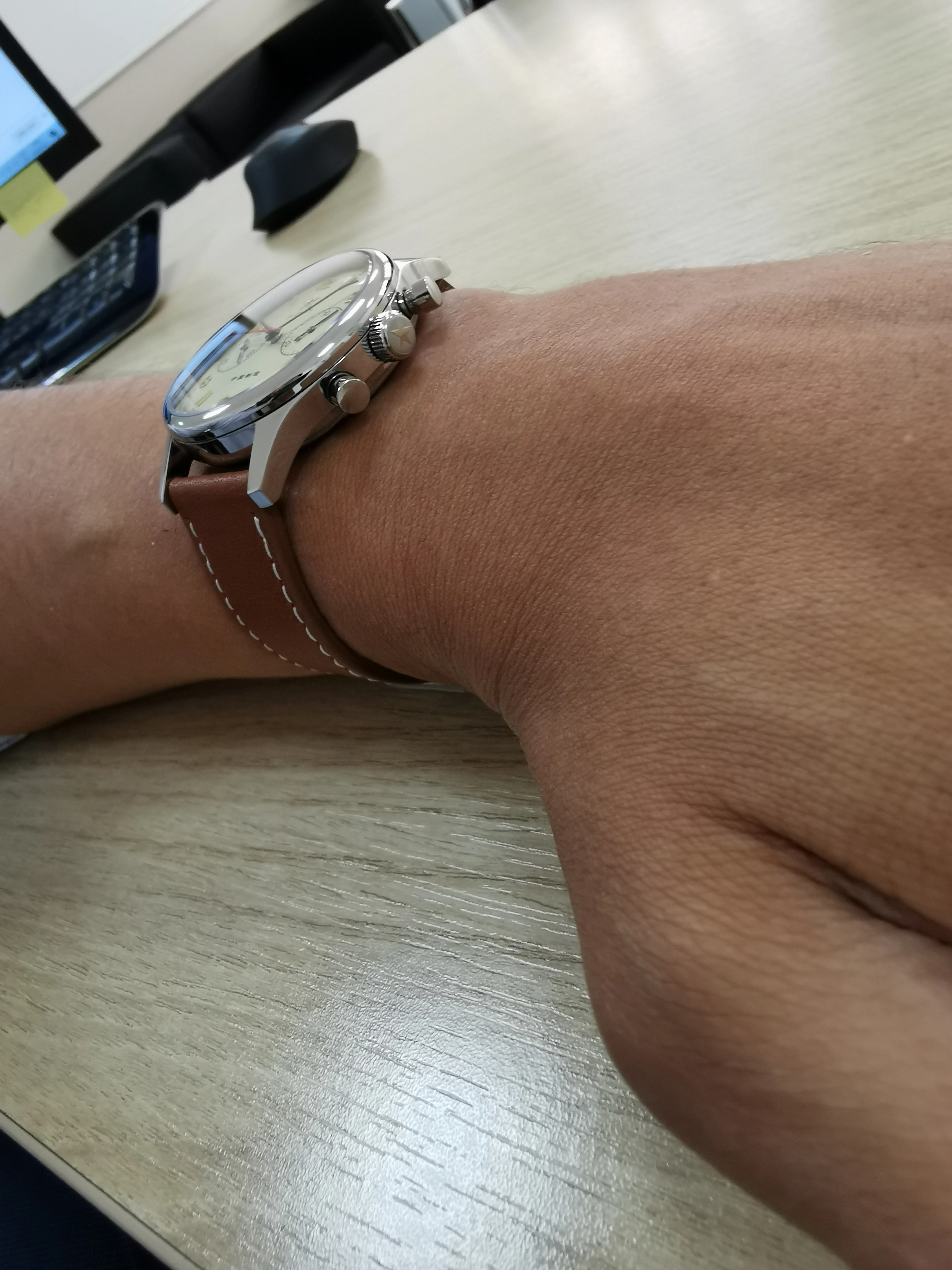 Очень хорошая вещь. 38 мм может быть немного меньше для больших запястья, но все равно стильно.