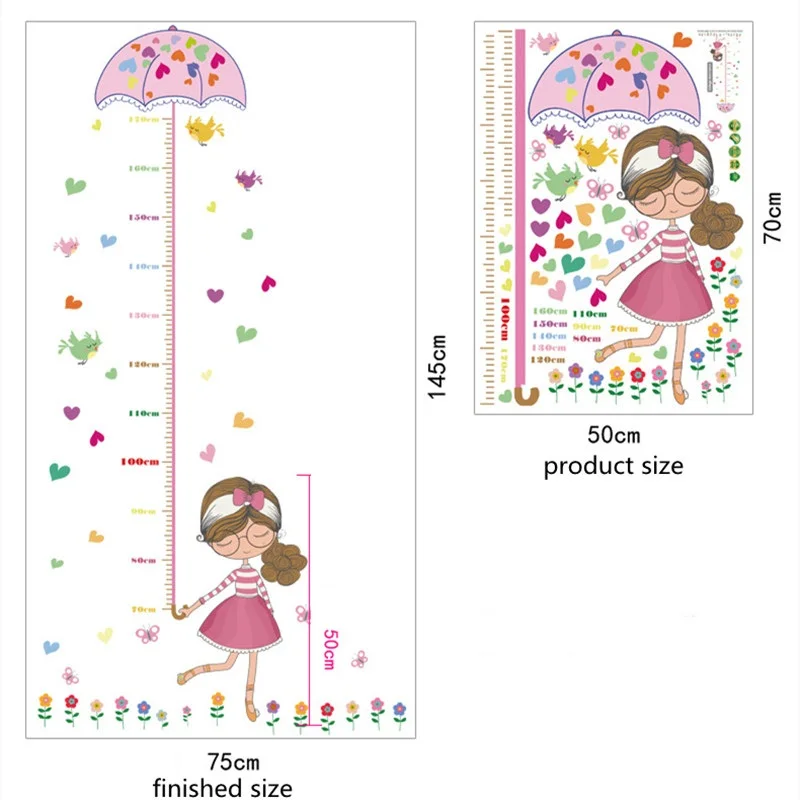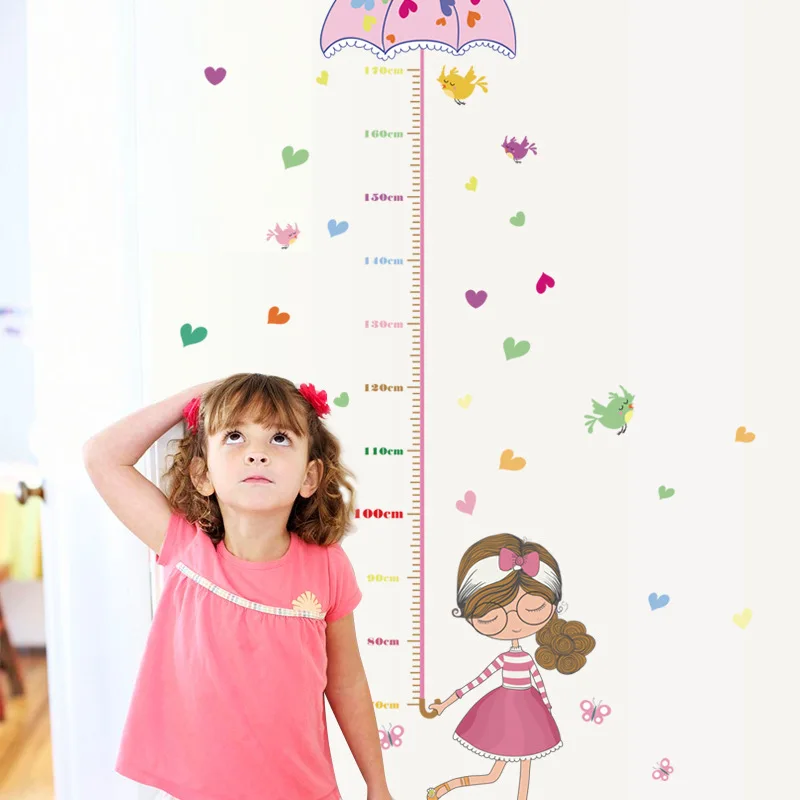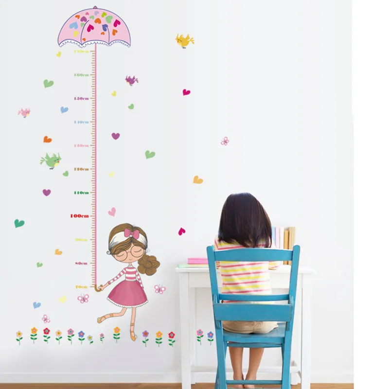 Милые Мультяшные настенные наклейки с измерением высоты, зонтик для девочек, спальни, цветок, Бабочка, птица, сердце, декор «сделай сам», обои, наклейка