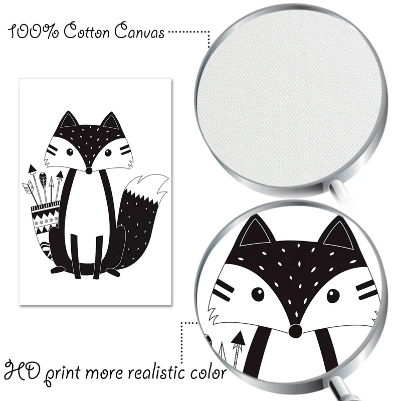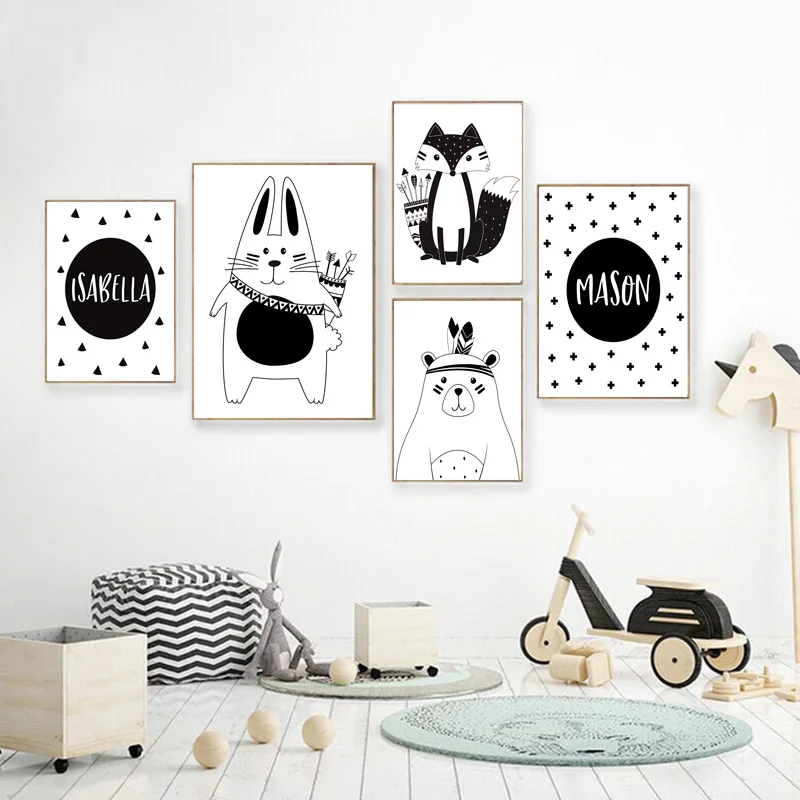 Черно-белый мультяшный Медведь Кролик Детский Настенный художественный холст постер на заказ с именным принтом Скандинавская Картина декор для детской комнаты