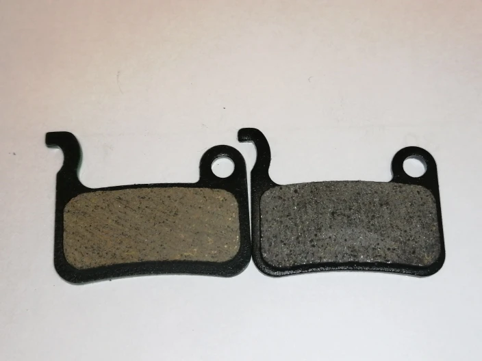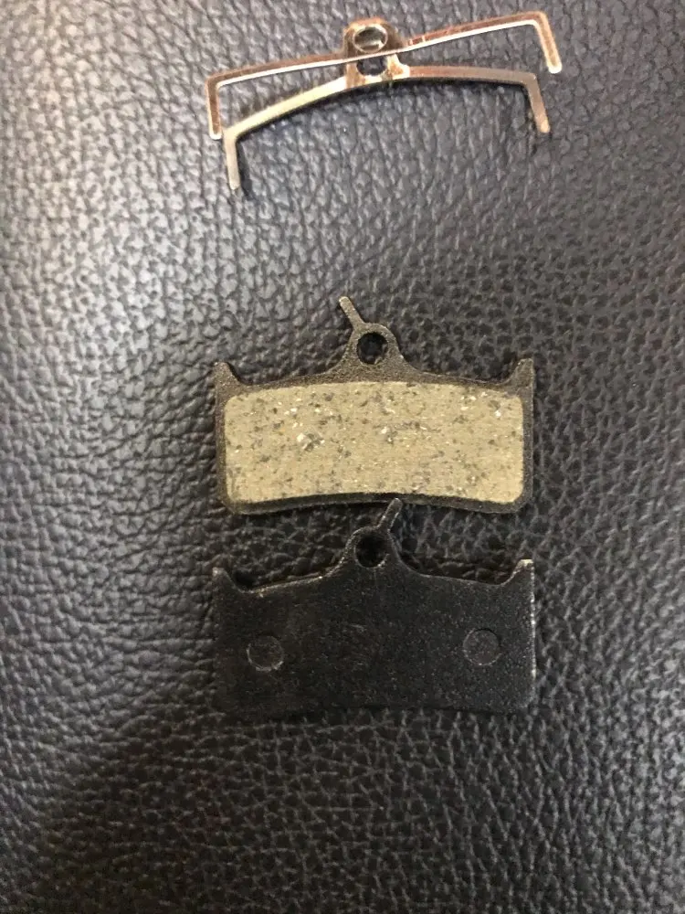 Слева керамическая колодка, справа - полуметаллическая. Размер абразивного материала на керамической меньше. Керамическая коричневая, полуметаллическая серая. В керамической металлическая стружка крупнее. В полуметаллической стружка мельче. На ощупь керамическая колодка более шероховатая, а полуметаллическая более гладкая. Полуметаллические колодки шли в комплекте с гидравликой Zoom.