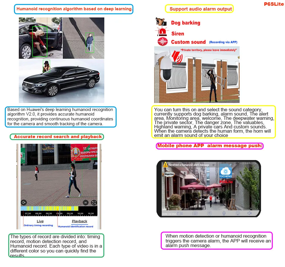 Третий поток используется для удаленного мониторинга плохой скорости сетиФункция распознавания гуманоидов на основе глубокого обучения поддерживает оповещение о распознавании гуманоидов, запись видео и захват SD-карты. Вывод звукового сигнала, push-сообщение APP мобильный телефон и другие функции.Поддерживает 8 групп накладок на символы OSD.