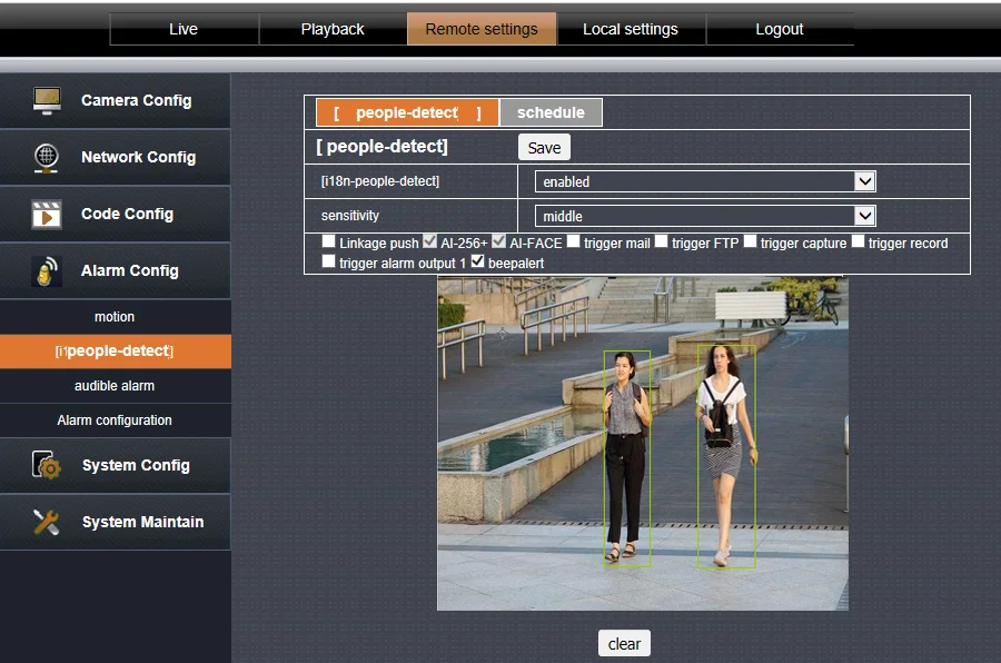 Поддержка локальной записи на компьютере, записи на SD-карту, запись в браузере, запись по FTP, запись клиентского программного обеспечения P2P. Запись видео включает в себя: Запись по времени, запись при обнаружении движения, запись по расписанию, запись по тревоге