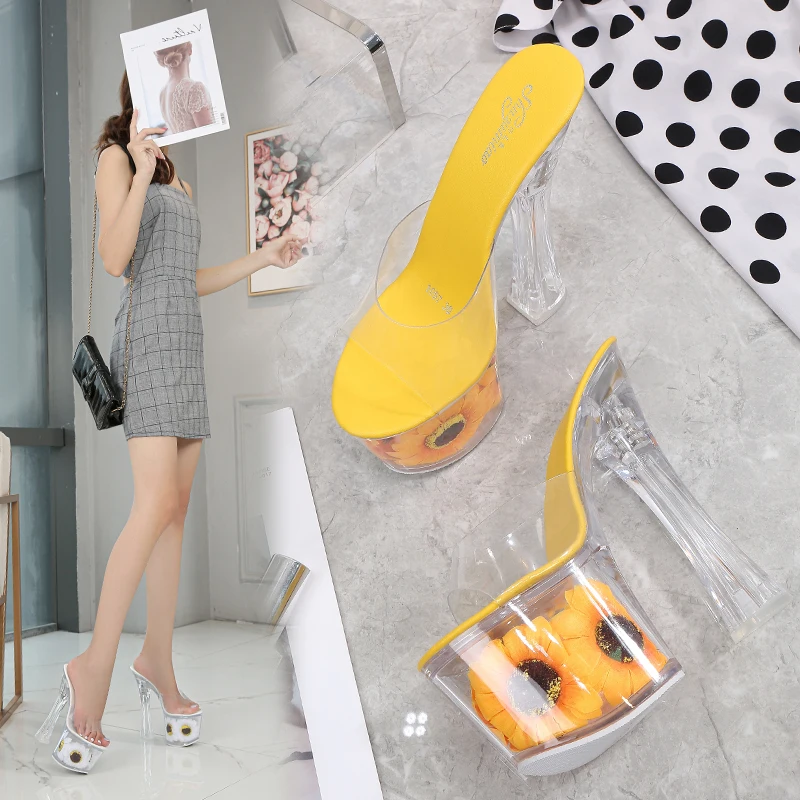 Женская модельная обувь на очень высоком толстом каблуке 17 см; Непромокаемые сандалии с открытым носком и подсолнухом; Прозрачная обувь со стразами; Свадебная обувь; Sho