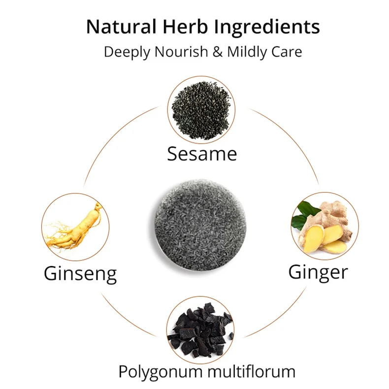 Женьшень, многоцветность полигония, имбирь и кунжут сочетаются для питания и оздоравливания волос и кожи головы.
