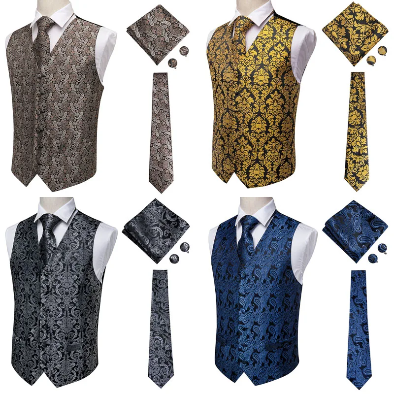 Костюм, жилет для мужчин, Классический жаккардовый жилет с пейсли и V-образным вырезом, жилет, носовой платок, жилет для вечеринки, свадьбы, галстука, комплект Карманный платок для костюма